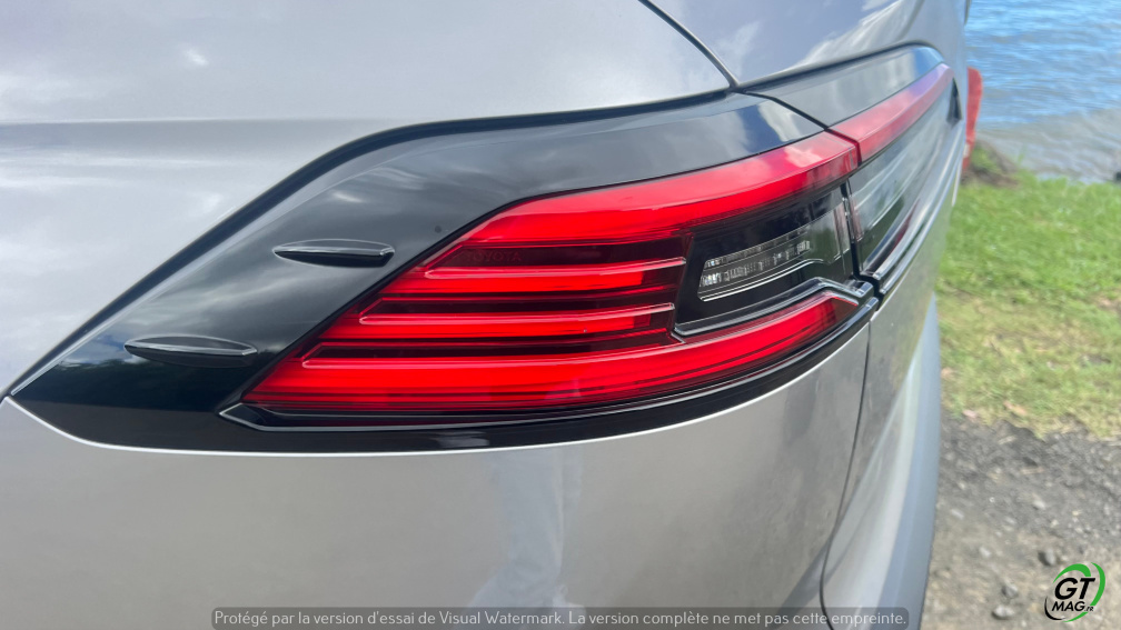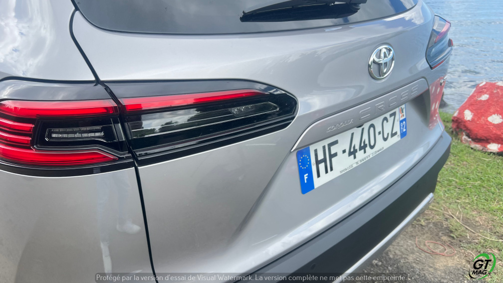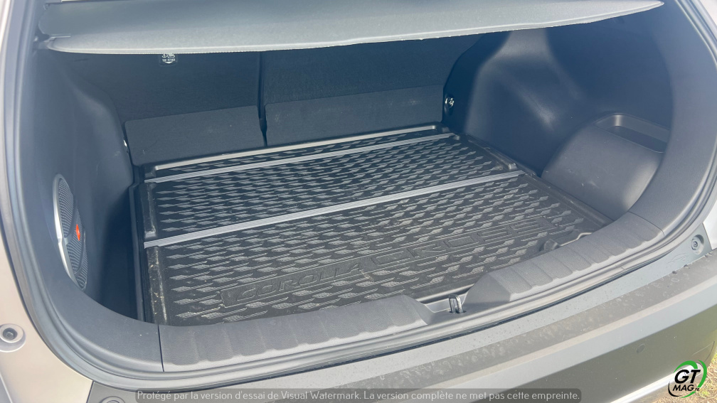 Le profil, lui, met en scène des ailes légèrement galbées, des jantes en alliage’ de 18’’ et des protections en plastique noir courant sur toute la partie inférieure de la carrosserie. Une élégante lame chromée vient dynamiser la ligne de toit, qui s’incline légèrement vers l’arrière, meublé par de larges blocs de feux. Le hayon, doté d’une ouverture entièrement motorisée, est une exclusivité de la finition haut de gamme «SRX», celle de notre modèle d’essai. On termine cette revue du Toyota Corolla Cross avec l’antenne de toit type requin et pour un plus bel effet des ornements supérieurs de vitres chromés… En prime de ces nouveautés, le SUV nippon peut également revêtir une finition GR Sport aux pare-chocs et jantes spécifiques ainsi qu'à la suspension abaissée de 10 mm.