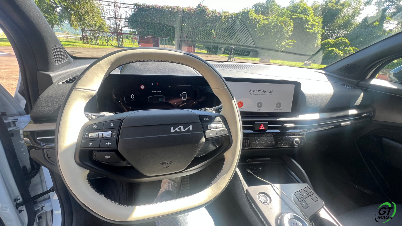 L’intérieur se transforme également très nettement…. Le Sportage hybride restylé reçoit de série un tableau de bord numérique de 10 pouces et un écran central tactile incurvé de 12,3 pouces réunis au sein d’une double dalle aux bords moins épais qu’auparavant. Les aérateurs de forme inédite sont maintenant rassemblés dans un bandeau ininterrompu courant sur toute la largeur de la planche de bord. Sous l’écran central, le réglage de la température passe toujours par des molettes. Les autres commandes de la ventilation sont plus ergonomiques. Entre le nouveau volant à deux branches et la console centrale, les ingénieurs ont su garder des boutons dédiés à certaines aides à la conduite, telle celle garantissant le maintien du véhicule dans sa voie. Conduite semi-autonome de niveau 2, caméras à 360° et chargeur de smartphone à induction font partie des équipements de notre modèle d’essai… Tout cela est résolument plus moderne…
