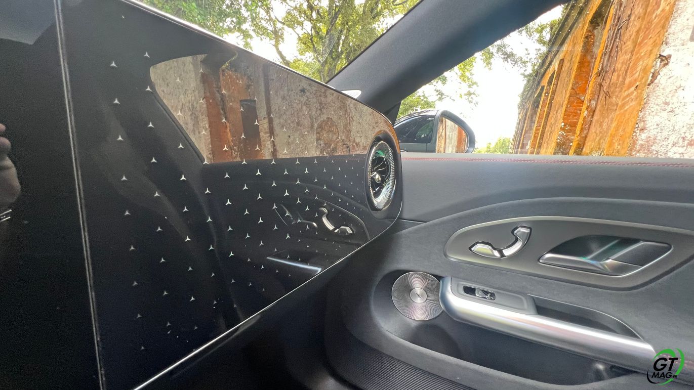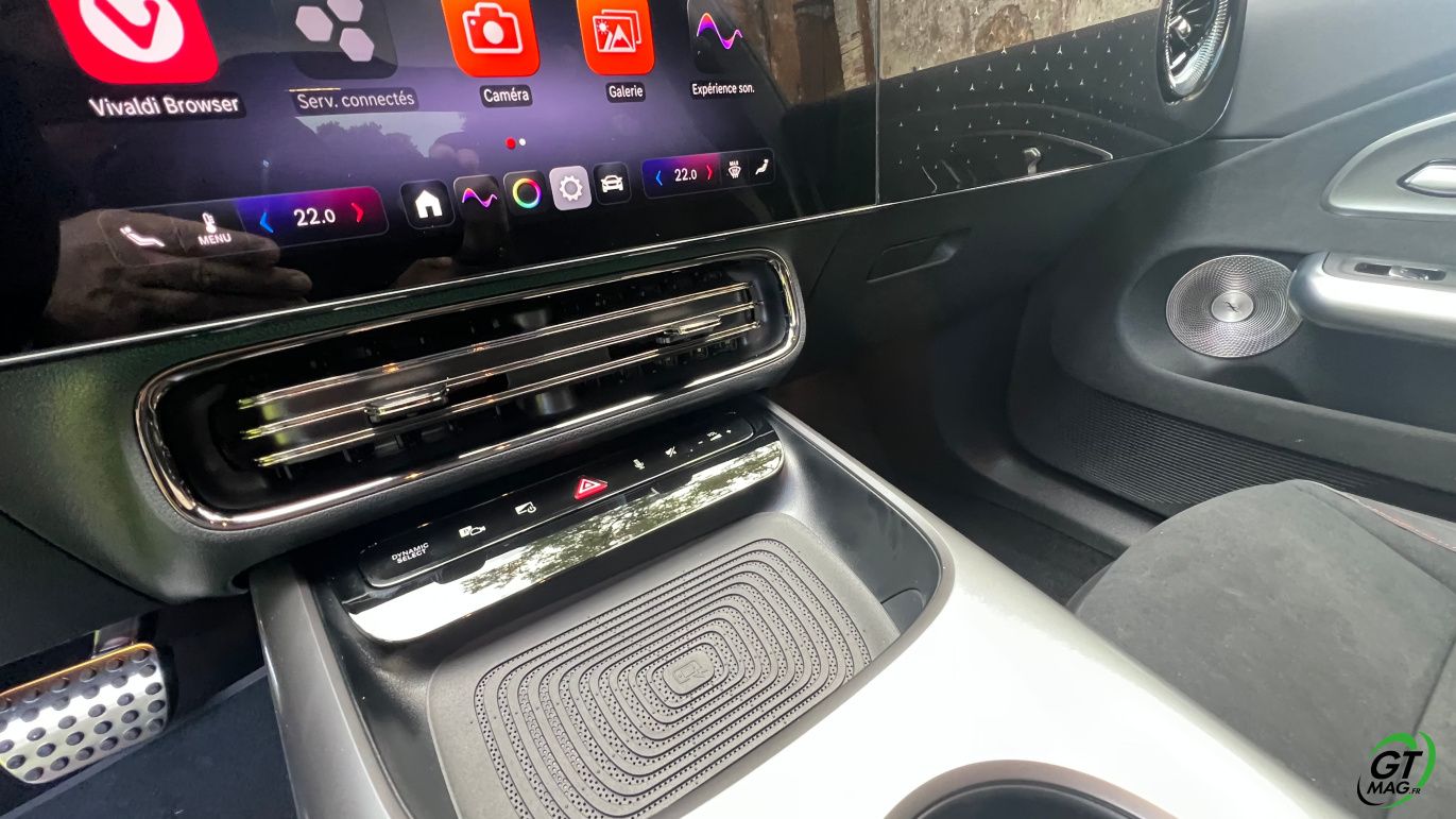 À bord, on découvre le « MBUXSuperscreen » Mercedes qui s’étend, de manière assez massive, sur toute la largeur de l’habitacle. Derrière une grande surface vitrée se trouvent l’écran du conducteur (10,25 pouces) et l’écran central (14 pouces). En option, un écran supplémentaire (14 pouces) est disponible pour le passager avant. Sans cette option, le passager aura, face à lui, une grosse pièce en plastique noir décorée d’étoiles. Ça impressionne, surtout avec l’écran passager. Si vous choisissez l’option écran passager, ce dernier bénéficie également d’un écran de 14 pouces, pour regarder des vidéos en streaming ou même jouer à des jeux pendant le trajet, grâce à un système d’assombrissement de l’écran qui évite de distraire le conducteur. Placées à gauche et à droite de ce « bloc », les ouïes de ventilation ont un aspect original, ce qui est moins le cas des ouïes placées sous l’écran central.