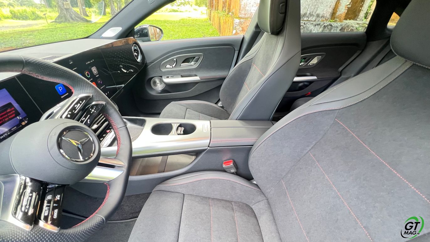 L’écran en lui-même est plutôt bien structuré, mais son fonctionnement diffère des systèmes Mercedes actuels. En effet, plutôt qu’un menu principal divisé en catégories, toutes les applications et menus sont regroupés dans un grand tiroir, à la manière d’un smartphone. La commande de la climatisation se fait également via l’écran, mais reste constamment visible. Sur la console centrale, seuls quelques boutons restent présents : ce sont ceux destinés aux modes de conduite, aux caméras de stationnement, à la désactivation de l’écran, aux feux de détresse, à l’assistant vocal et au volume. Les deux pavés tactiles sur le volant, qui permettaient auparavant de contrôler l’écran conducteur à gauche et l’infodivertissement à droite, ont disparu. Le volant, lui, sera prochainement mis à jour, puisqu’un tout nouveau modèle a fait ses débuts sur la Mercedes CLA avec… de vraies molettes physiques pour le volume et le régulateur de vitesse !