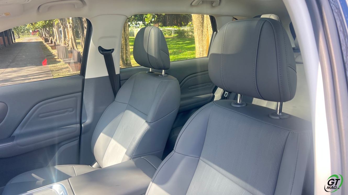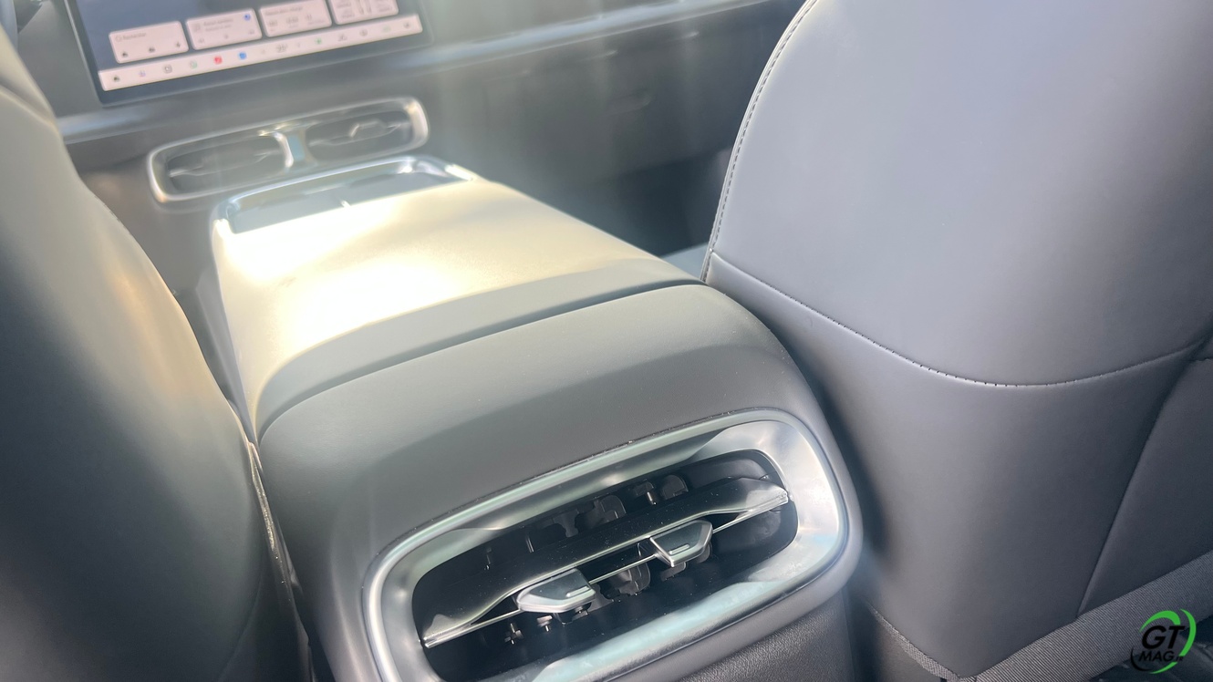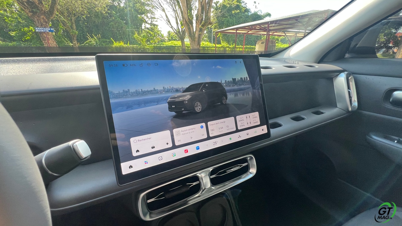 Dans l’habitacle, le Leapmotor B10 suit son propre chemin avec une planche de bord à deux étages. À notre grand étonnement et plaisir, on trouve des buses de ventilation, ainsi qu’un espace de rangement bien pratique devant le passager. En sus, il y a un grand bac dans la console centrale et deux porte-gobelets escamotables. Une chose est sûre : ce ne sont pas les rangements qui manquent ! D’ailleurs, toujours sur le point du rangement et de l’habitabilité : le Leapmotor B10 joue bien de sa taille pour offrir un habitacle généreux. Devant comme derrière, tous les passagers seront bien assis, tandis que le coffre taille à 430 litres. Mieux encore, il y a 25 litres d’espace sous le capot. Pratique pour les câbles ! Côté infodivertissement, tout passe va une grande dalle tactile de 14,6 pouces – en plus d’une instrumentale digitale de 8,8 pouces. Quand on dit « tout », c’est vraiment « tout », puisque le B10 ne présente aucun bouton. Pas même pour régler les rétroviseurs…
