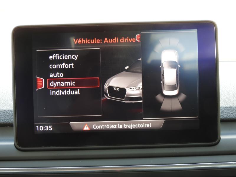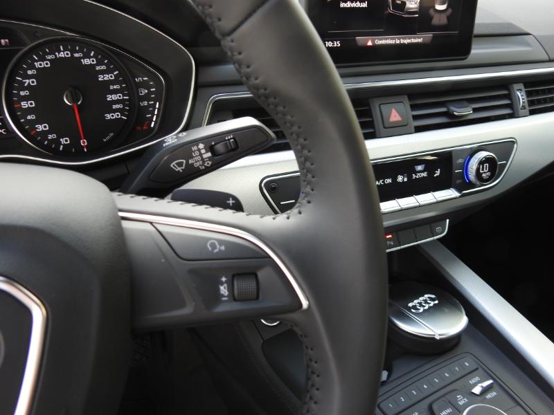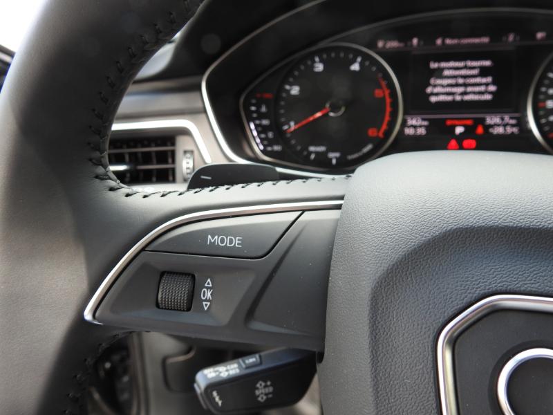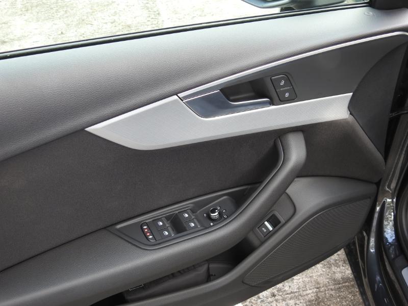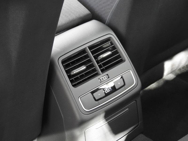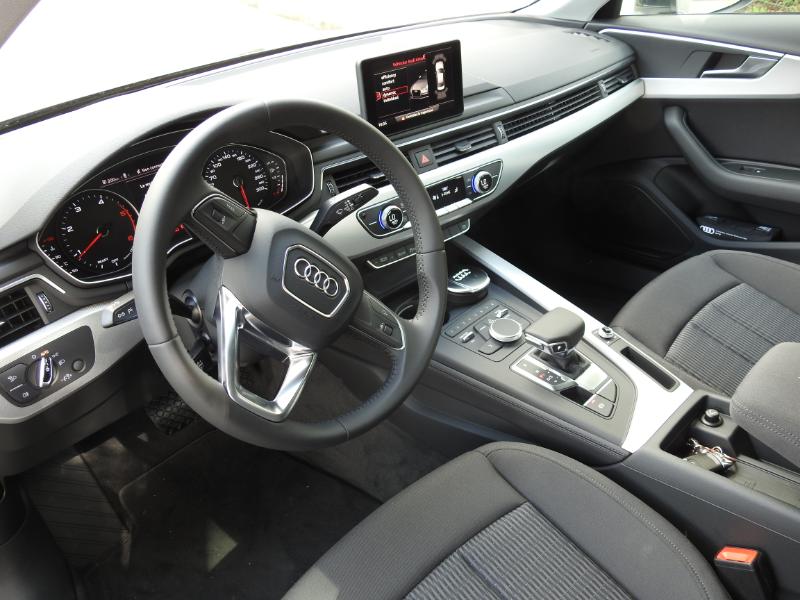 Les proportions sont d’ailleurs presque les mêmes : 4,73 m de long (A4 B8 : 4,71 m), 1,84 m de large (1,82 m), et 1,43 m de haut (1,44 m). Malgré tout, les rétroviseurs, habituellement intégrés dans les montants, sont dorénavant déportés sur les portes. Les parties avant et arrière consentent à plus de changement. Ainsi à l’avant les phares voient leur dessin se complexifier, tandis que la calandre «Single Frame» aux coins cassés se remarque encore plus qu’auparavant, et intègre des barrettes chromées sur les versions haut de gamme. En fait, si l’A4 B8 (lancée pour rappel fin 2007 et restylée fin 2011) avait quelques rondeurs,l’A4 B9 vient toutes les effacer. C’est carré, et aussi plus agressif en définitive : une impression accentuée sur la version S-Line, qui rend plus sportif le design de l’A4 (mais pas que, comme on le constatera plus loin dans l’article). L’arrière quant à lui profite de feux légèrement en relief, d’un bel effet. Il est d’ailleurs agréable de constater que la berline et le break n’ont pas tout à fait les mêmes feux : c’était déjà le cas avant, mais la différence est plus visible aujourd’hui. Leur forme est différente : la berline s’octroie une petite originalité, en semblant vouloir «détacher» les feux de recul du reste des optiques. Contrairement à l’avant, très «géométrique» , l’arrière paraît plus doux esthétiquement. Le design de l’A4 évolue, malgré les apparences (aucune pièce de carrosserie n’est commune entre les A4 B8 et B9). Certains diront que cela reste néanmoins trop classique et dénué de saveur. Ceci dit, le dessin extérieur sobrede cette A4 reste de bon goût : tout est «à sa place», et les proportions sont bonnes. En tout cas, l’intérieur lui, devrait mettre tout le monde d’accord. Pas d’hésitation possible une fois assis à bord : l’intérieurde l’A4 B9 est bien différent de celui de la B8. Alors qu’auparavant le tableau de bord, vertical, était tourné vers le conducteur, la planche de bord de l’A4 B9 s’étend quant à elle sur toute la largeur de l’habitacle. Cette sensation de largeur est renforcée par les aérateurs centraux qui semblent «s’étirer» jusqu’à l’aérateur du passager. Un «artifice» déjà vu sur le nouveau Q7…mais aussi sur la dernière génération de Volkswagen Passat. Mais plus encore, c’est l’ergonomie de cette planche de bord qui frappe. Les boutons ont été réduits au maximum. Sous les aérateurs, on retrouve les commandes de la climatisation. Encore en-dessous, il y a très exactement six boutons (comprenant, entre autres,l’Audi drive select pour les modes de conduite ou encore la déconnexion du Stop&Start). Puis, autour du levier de vitesse, on retrouve la commande du système de navigation MMI, le frein de parking et le bouton permettant de réguler le son, de la radio notamment. Et c’est tout ! La plupart des fonctions sont en fait à retrouver grâce au MMI, qui gère la partie multimédia. A l’usage, la subdivision en menu s’avère pratique, et l’accès aux foncions assez aisé… Puisque l’on parle de l’écran (fixe), sa taille est de 7 pouces en série. Si vous sélectionnez l’option «Navigation Plus» (présente sur nos modèles d’essai), incluant le« MMI touch » (qui permet de tracer avec ses doigts, via un pavé central, les lettres composant le nom de la destination), l’écran sera de 8,3 pouces.