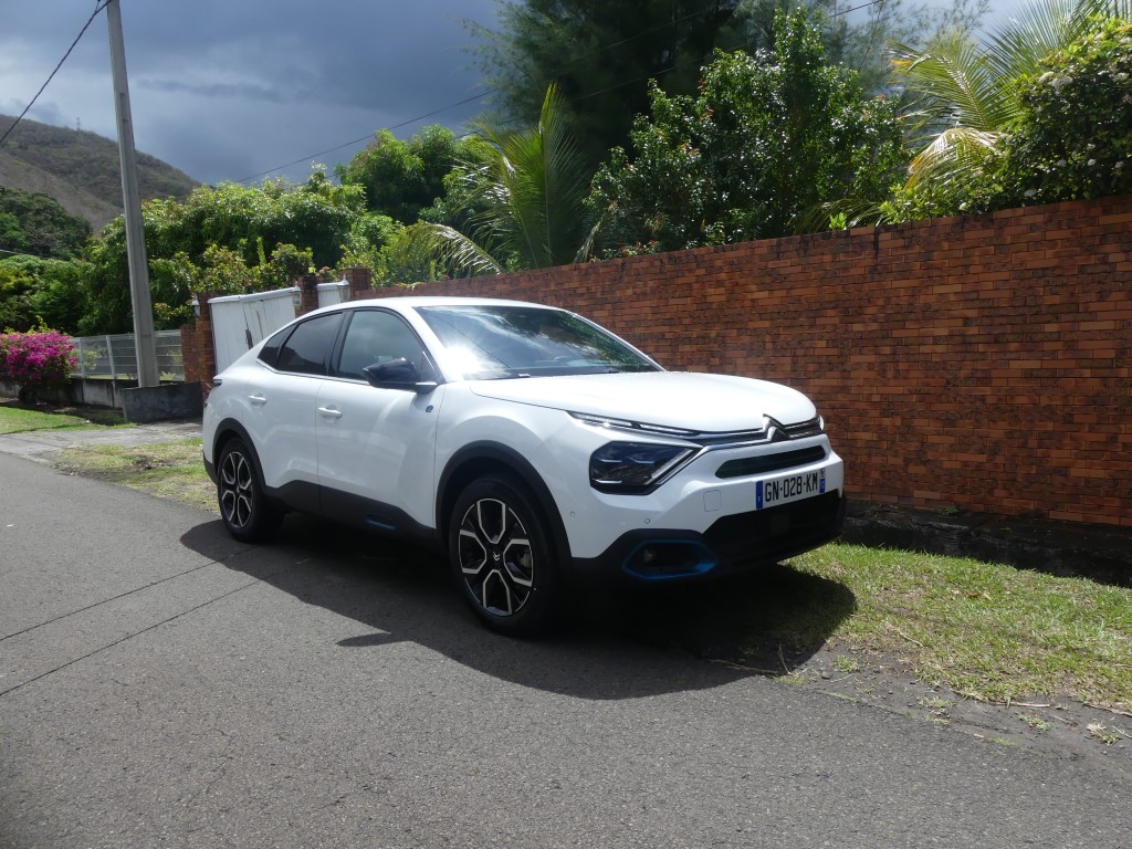 Nous prenons en main ce matin avec Orlane sur les routes de Martinique la toute nouvelle Citroën ë-C4 100 % électrique… Directement liée au segment de la berline compacte, la nouvelle ë-C4 sort en effet de l’ordinaire par les nouveautés stylistiques qui l’apparente finalement à un SUV (avec son haut capot et une garde au sol de 156 mm) et un coupé (avec un pavillon fuyant vers l’arrière). Mais surtout, le des...