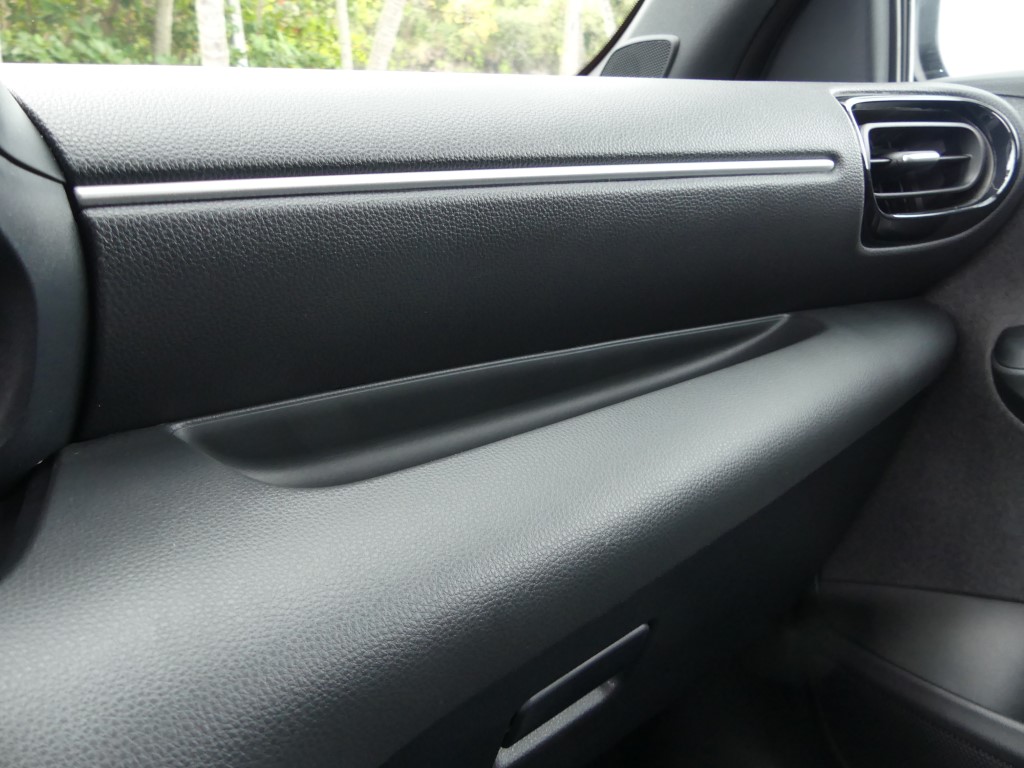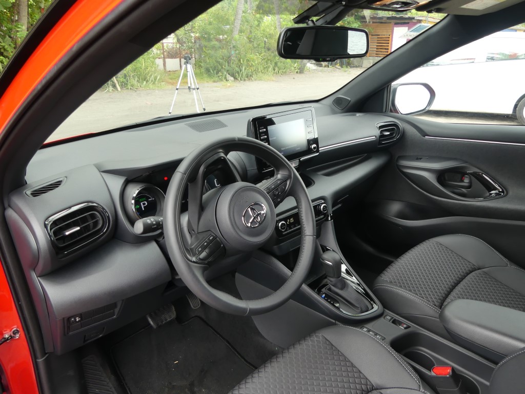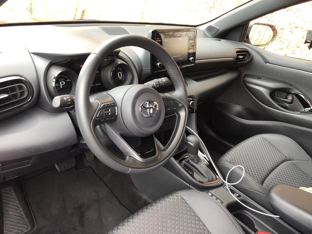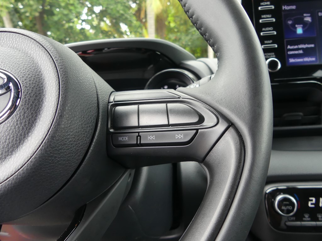A bord, pas de surprise. On retrouve la Yaris que nous connaissions. Avec l'écran du GPS un peu tourné sur la droite favorisant l’accès au passager avant, l'habitabilité est toujours aussi bonne c’est une de ses forces. Pas trop large et un peu haute, la Yaris accueille facilement 4 adultes, et par rapport à une Clio ou d'autres modèles récents, cette auto jouit d'une visibilité arrière plus que correcte. Toutes les commandes sont bien accessibles, les cadrans bien lisibles, et la garniture de la portière permet le rangement d'une grande bouteille d'eau. Ce qui confirme les origines européennes de l'auto (Je rappelle que la Yaris est fabriquée en France, mais tout le monde doit le savoir, tant Toyota a communiqué sur ce sujet). Chose à souligner enfin, puisque ce choix devient rare, la Yaris est livrable en 3 ou 5 portes.