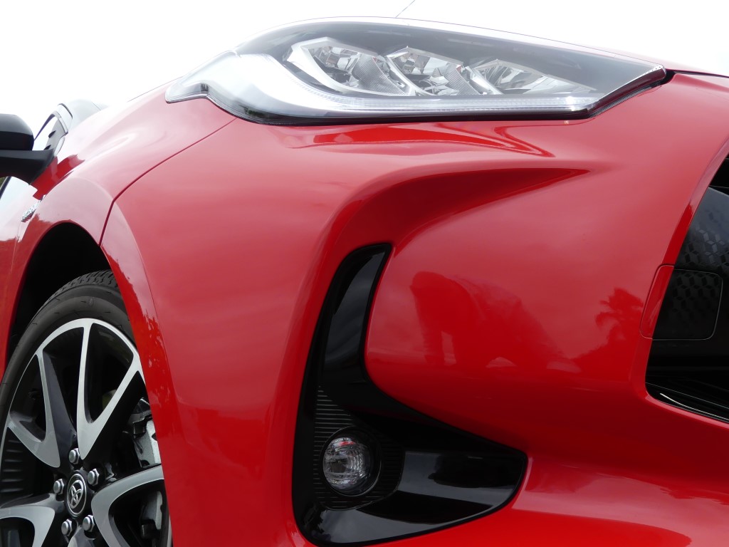Côté lignes extérieurs rappelons-nous que courbes et douceurs n’étaient pas de mise sur la dernière version alors que pour cette nouvelle génération Toyota réalise l’opposé dans la douceur des traits tout en lui insufflant un caractère bien à elle… Moi j’adore ce nez plongeant flanqué d’une calandre inversé avec deux grands yeux en forme de goutte qui viennent nourrir une allure voulue plus sportive… D’ailleurs en version Sport cette face avant sera, encore plus, un régal pour les yeux… Nez plongeant, regard acéré, bouche béante, la nouvelle Yaris ne cache pas ses nouvelles petites rondeurs et une volonté de passer à une agressivité conceptuelle pour sans doute attirer une clientèle plus jeune… L’arrière lui gagne un large bandeau noir qui relie les deux feux en forme de C inversé plus bas un sabot remontant façon SUV…