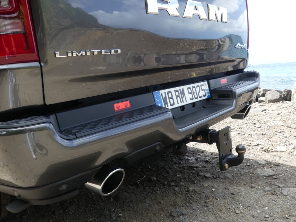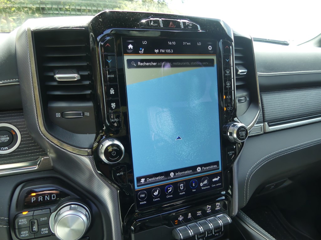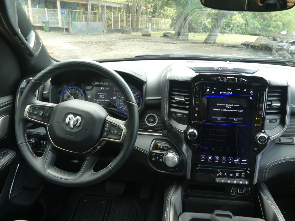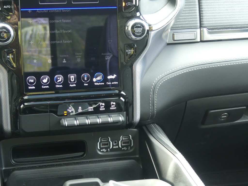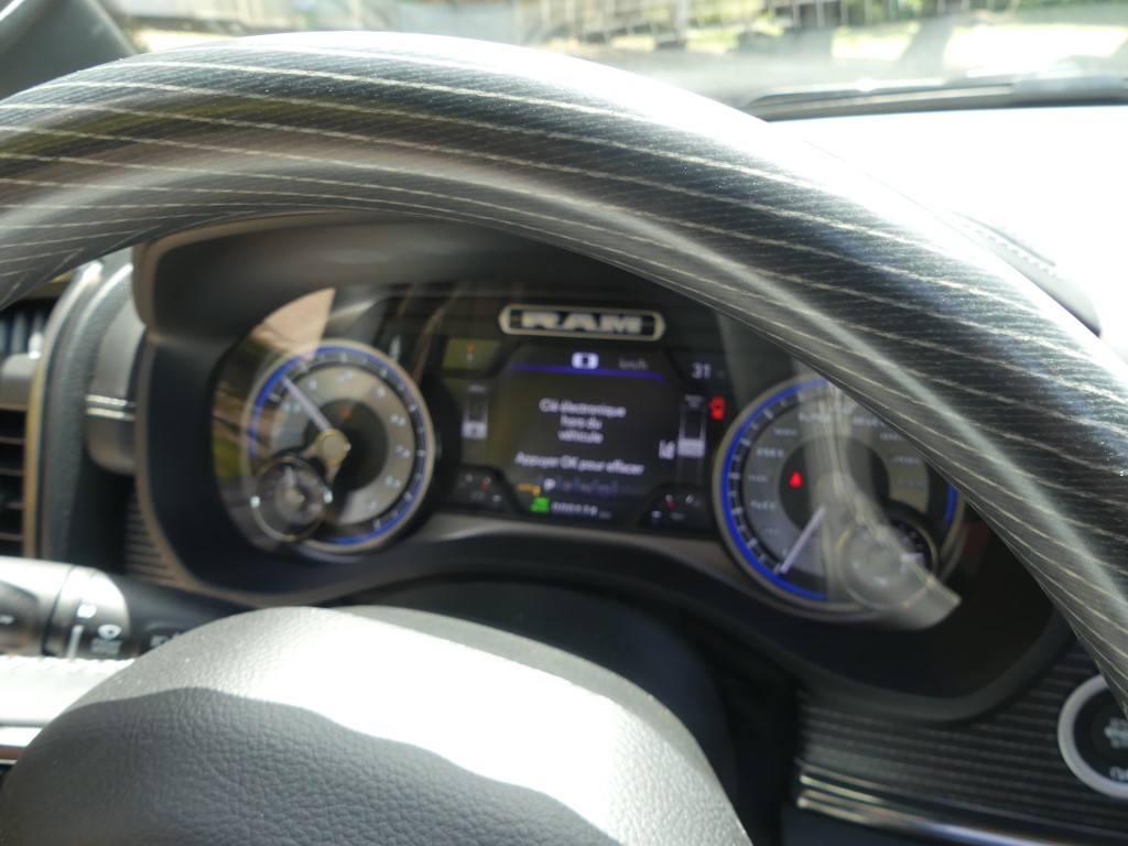 Comme nous le savons, la première production du RAM 1500 n’intègre pas le fameux système « eTorque mild-hybrid » qui permet un couple électrique supplémentaire grâce à l’apport d’une pile de 48 volts pour la première moitié de tour de roue. Le système se montre pourtant plutôt bienvenu et contribue à faire descendre la consommation de la bête. Nous le verrons débarquer sans doute dans les prochains mois… Rappelez-vous sous le capot de notre version, on retrouve l’éternel V8 HEMI de 5,7 litres avec sa tonitruante puissance de 400 chevaux et un couple de 556 NM. Provenant de la précédente génération, la boite automatique à huit rapports revient et c’est parfait. Le mariage de ce V8 et de cette 8 vitesses fonctionne particulièrement bien. Afin de se donner une certaine conscience écologique, le système propose la désactivation des cylindres comme nous l’avons vu. Sur ce point, RAM n’a pas mis en place un vrai mode ECO qui aurait « forcé » un peu plus souvent la désactivation. Dans les meilleures conditions routières possible, le régime ECO en vert apparaît que très rarement sur l’écran. De la même façon il n’y a pas de mode « Sport », comme on le voit souvent dans la grande famille des Pick-up. Étant donné que la mécanique est puissante, cette option aurai sûrement apporté des salves de puissances en sus. Au terme de l’essai en trajet mixte, nous trouvons une sûre moyenne de plus de 12.5 litres/100 km.