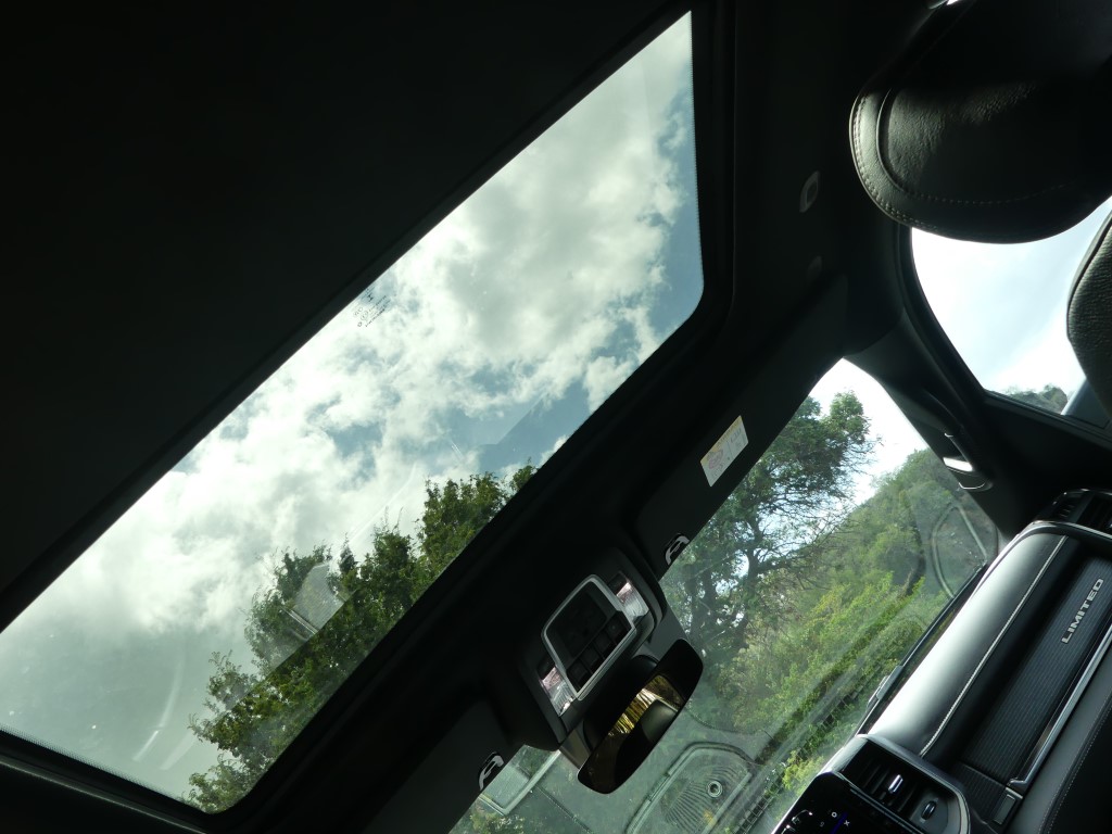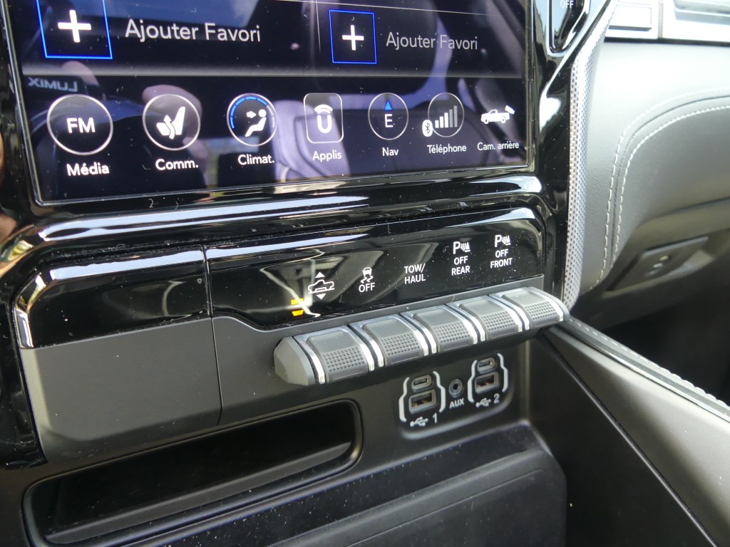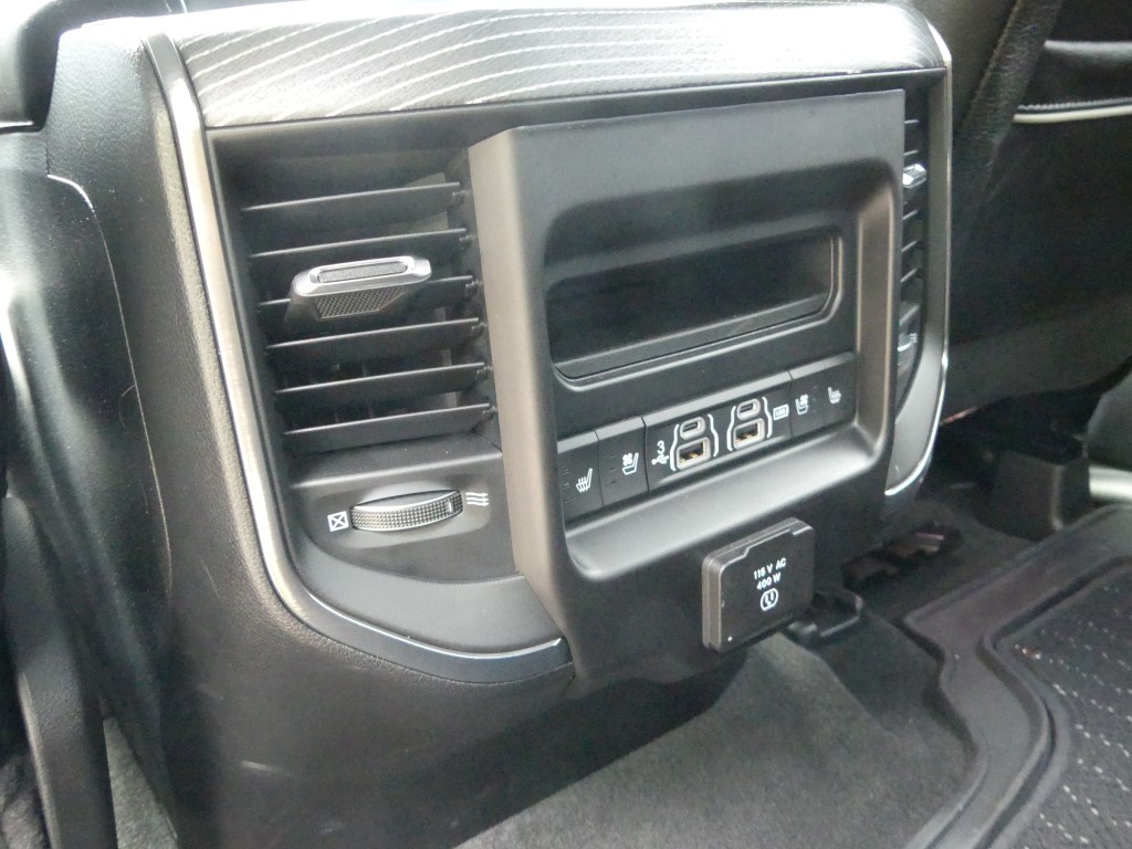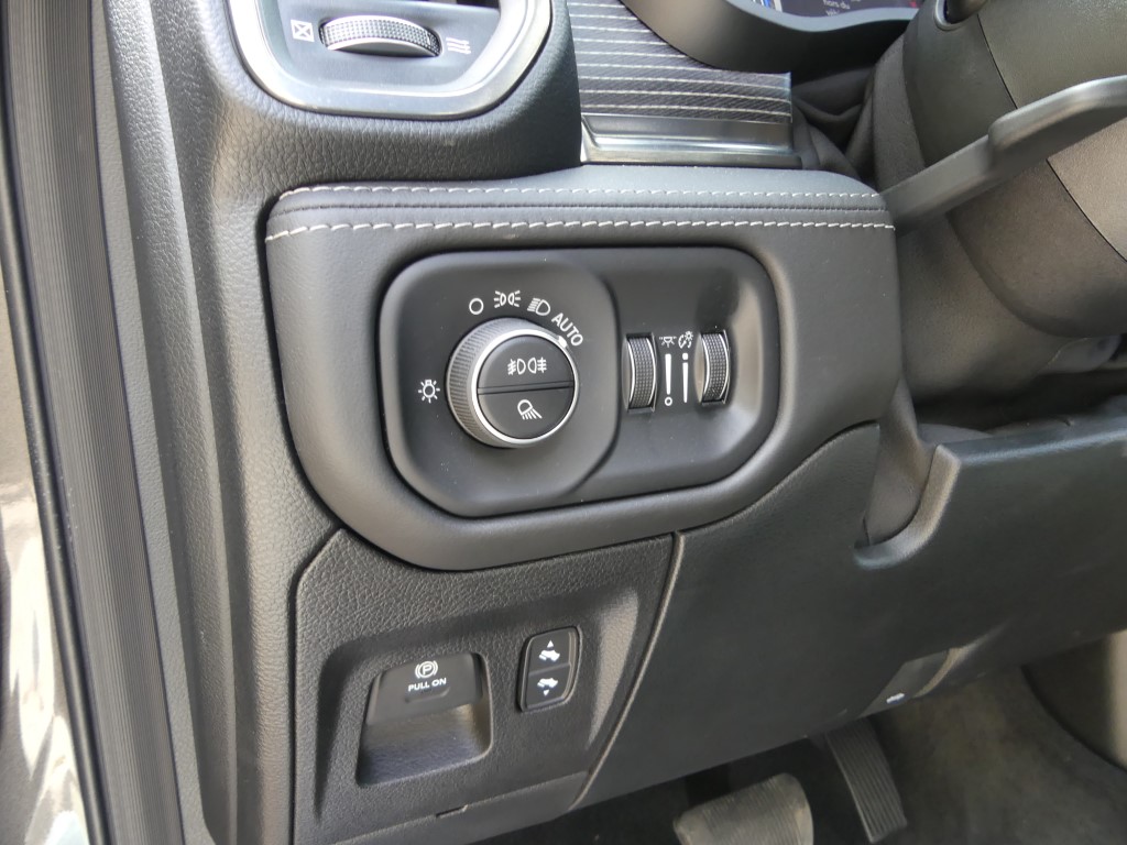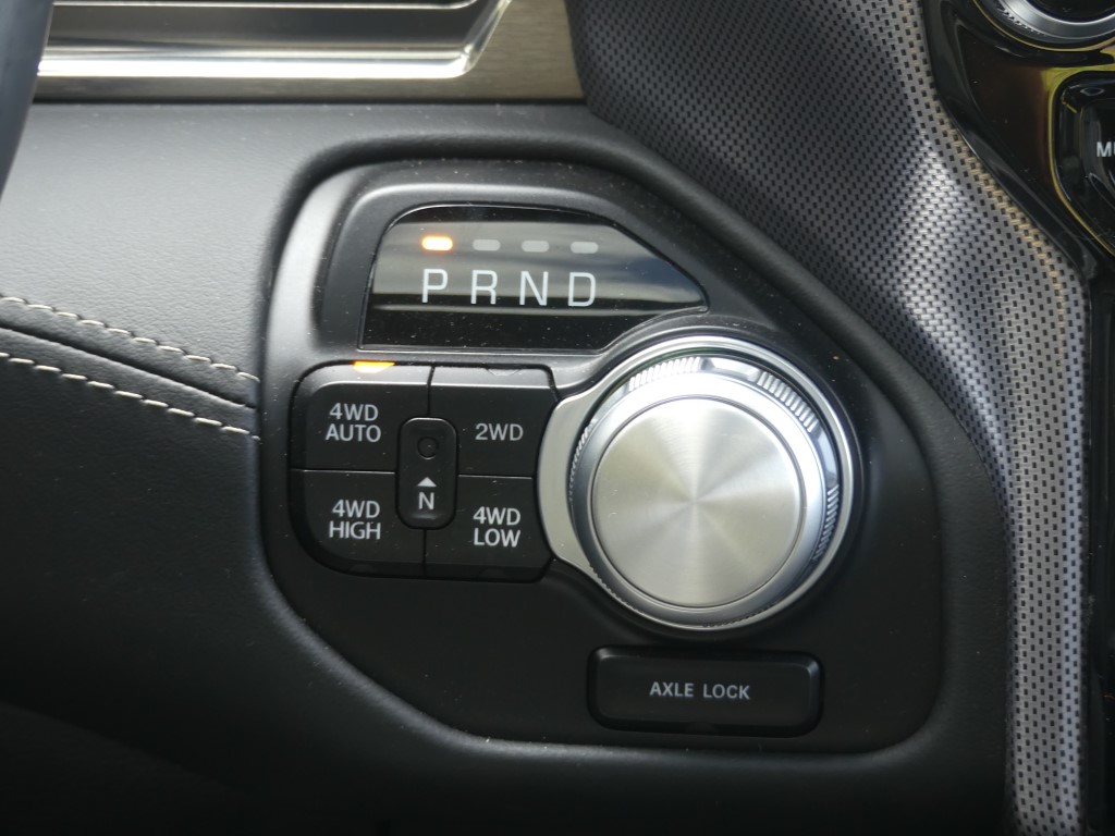 Comme nous le savons, la première production du RAM 1500 n’intègre pas le fameux système « eTorque mild-hybrid » qui permet un couple électrique supplémentaire grâce à l’apport d’une pile de 48 volts pour la première moitié de tour de roue. Le système se montre pourtant plutôt bienvenu et contribue à faire descendre la consommation de la bête. Nous le verrons débarquer sans doute dans les prochains mois… Rappelez-vous sous le capot de notre version, on retrouve l’éternel V8 HEMI de 5,7 litres avec sa tonitruante puissance de 400 chevaux et un couple de 556 NM. Provenant de la précédente génération, la boite automatique à huit rapports revient et c’est parfait. Le mariage de ce V8 et de cette 8 vitesses fonctionne particulièrement bien. Afin de se donner une certaine conscience écologique, le système propose la désactivation des cylindres comme nous l’avons vu. Sur ce point, RAM n’a pas mis en place un vrai mode ECO qui aurait « forcé » un peu plus souvent la désactivation. Dans les meilleures conditions routières possible, le régime ECO en vert apparaît que très rarement sur l’écran. De la même façon il n’y a pas de mode « Sport », comme on le voit souvent dans la grande famille des Pick-up. Étant donné que la mécanique est puissante, cette option aurai sûrement apporté des salves de puissances en sus. Au terme de l’essai en trajet mixte, nous trouvons une sûre moyenne de plus de 12.5 litres/100 km.