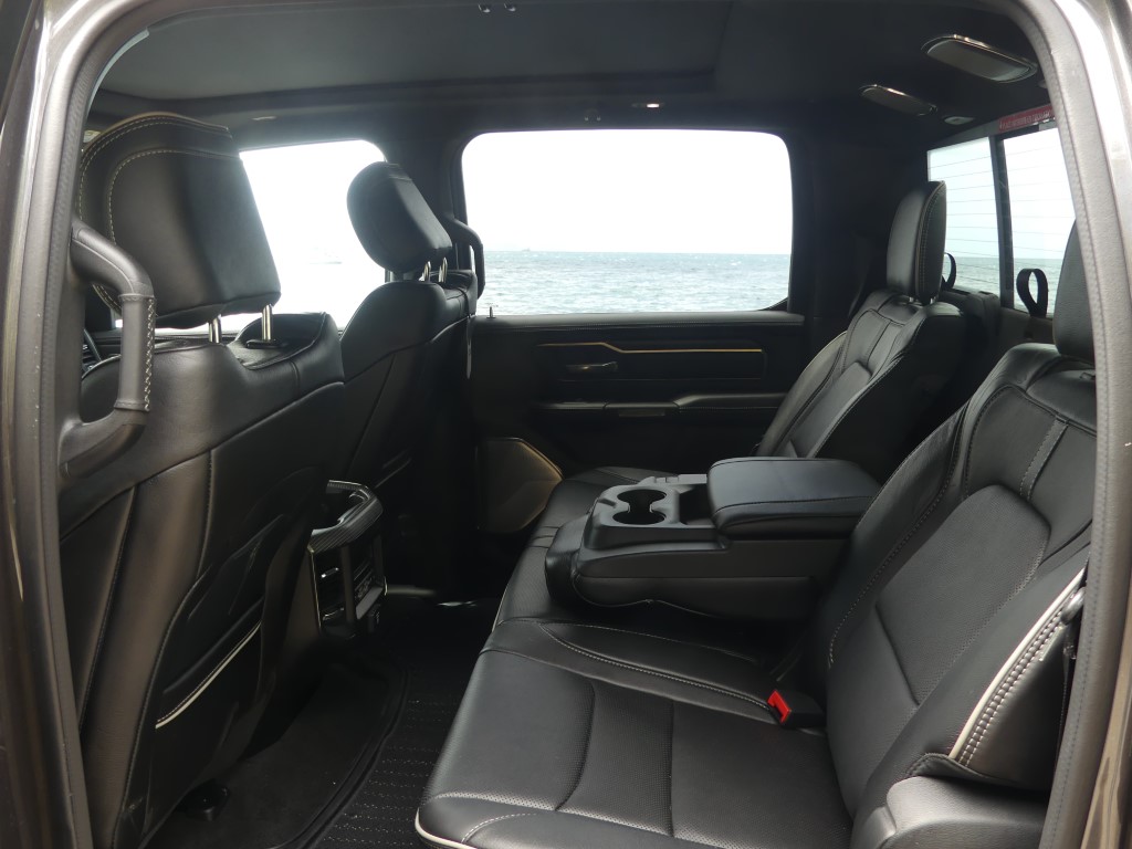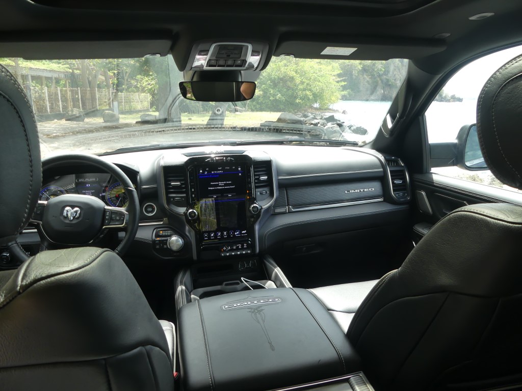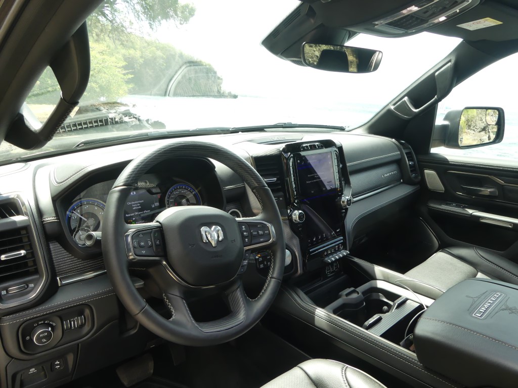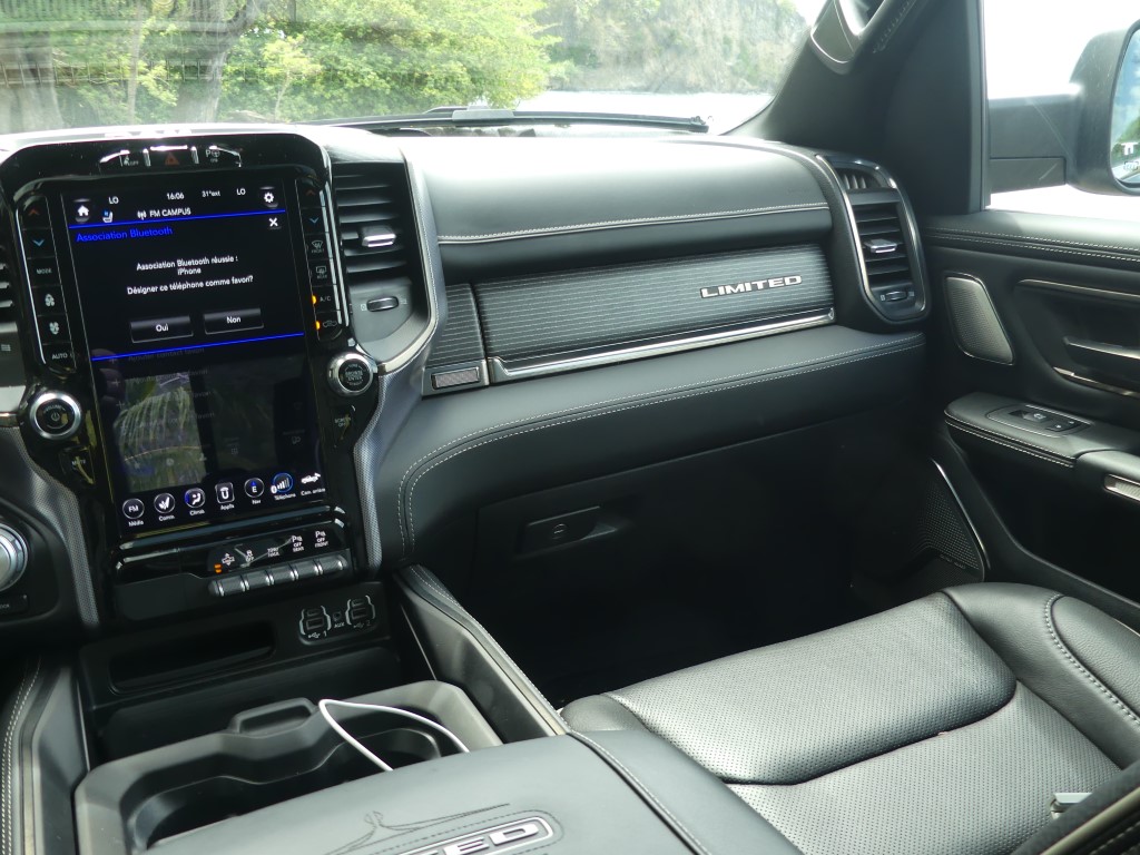 Au-delà des fonctions ajoutées, le Ram 1500 Limited se veut une fichue de belle manière de se déplacer au quotidien, la richesse des matériaux qui tapissent l’intérieur étant à la hauteur d’une camionnette de ce prix. En fait, à mon avis, l’échelon le plus luxueux de la gamme est le mieux réussi de l’industrie au moment d’écrire ces lignes, quoique la nouvelle génération du Ford F-150 vient titiller le pickup US Ram depuis quelques mois. Du cuir qui tapisse à peu près tous les panneaux de la cabine aux sièges deux tons… en cuir(!), sans oublier ce superbe volant chauffant et agréable à tenir en main et cet écran capable de faire rougir votre tablette intelligente, l’environnement intérieur du Ram 1500 Limited se veut invitant. À l’intérieur, on s’aperçoit rapidement que l’insonorisation a été retravaillée avec ses vitres acoustiques, le son du V8 qui se fait à peine entendre dans l’habitacle. Et puis, il y a le rangement, un aspect que maîtrisent plutôt bien les camionnettes familiales de nos jours, mais le Ram 1500 s’acquitte très bien de sa tâche de garde-robe sur roues. Mentionnons également la présence de ces marchepieds escamotables qui facilitent encore plus l’accès à bord, un luxe à l’image de l’écusson.