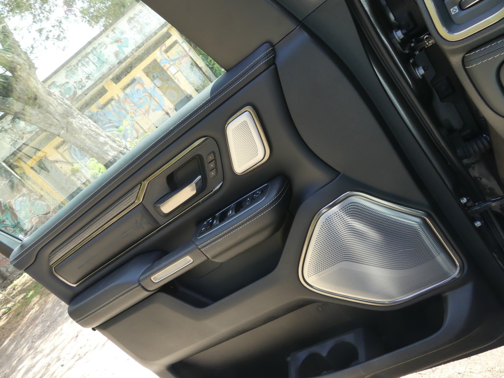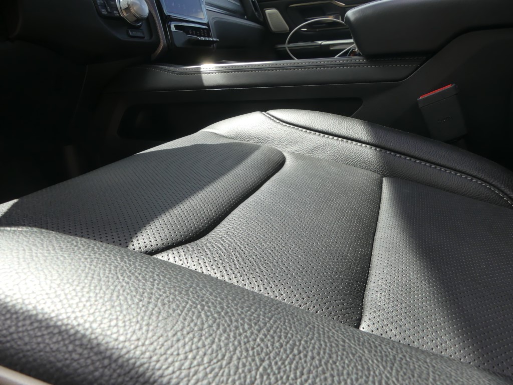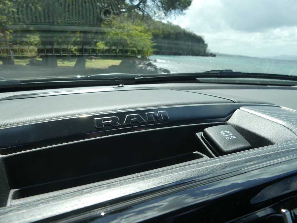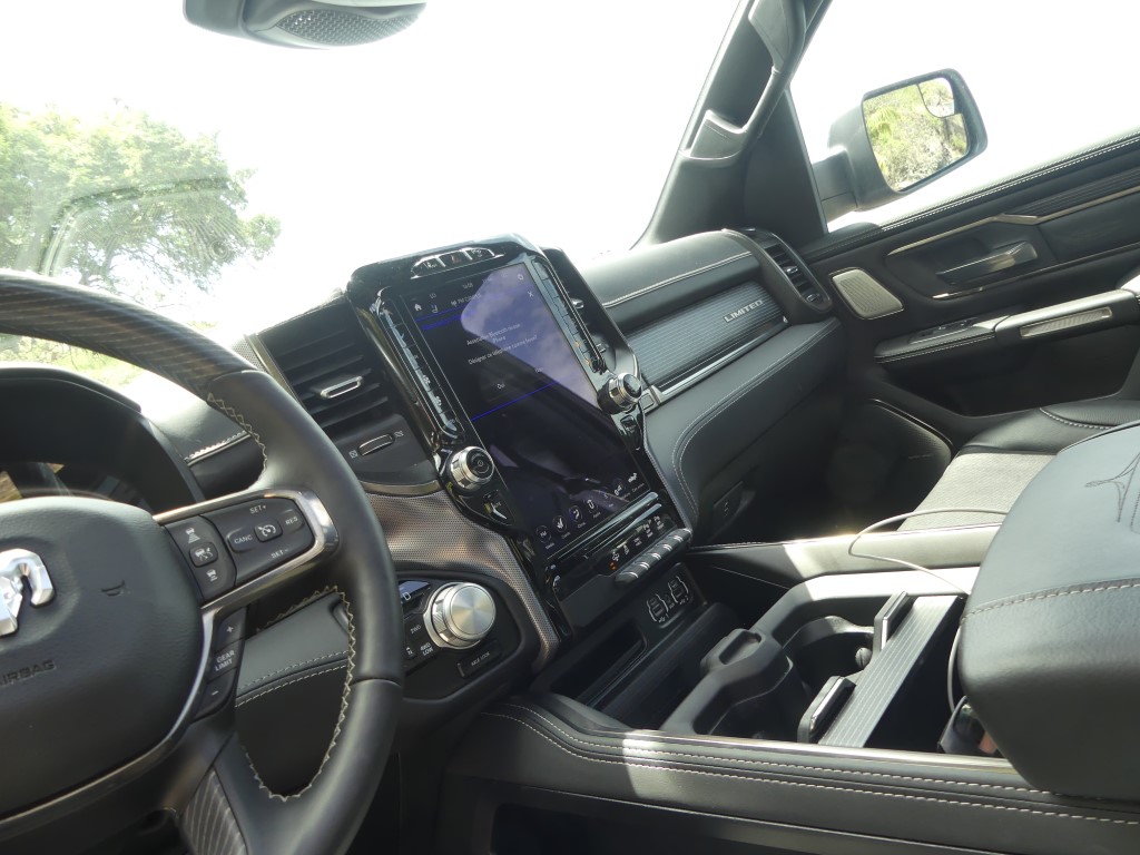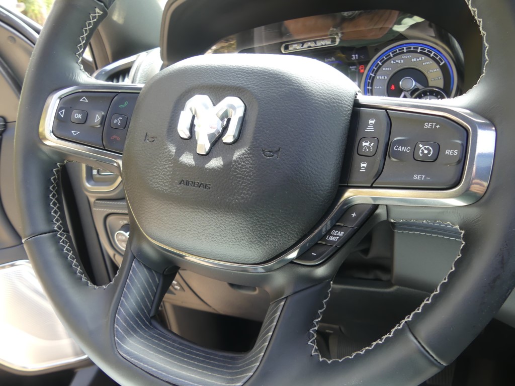 Au-delà des fonctions ajoutées, le Ram 1500 Limited se veut une fichue de belle manière de se déplacer au quotidien, la richesse des matériaux qui tapissent l’intérieur étant à la hauteur d’une camionnette de ce prix. En fait, à mon avis, l’échelon le plus luxueux de la gamme est le mieux réussi de l’industrie au moment d’écrire ces lignes, quoique la nouvelle génération du Ford F-150 vient titiller le pickup US Ram depuis quelques mois. Du cuir qui tapisse à peu près tous les panneaux de la cabine aux sièges deux tons… en cuir(!), sans oublier ce superbe volant chauffant et agréable à tenir en main et cet écran capable de faire rougir votre tablette intelligente, l’environnement intérieur du Ram 1500 Limited se veut invitant. À l’intérieur, on s’aperçoit rapidement que l’insonorisation a été retravaillée avec ses vitres acoustiques, le son du V8 qui se fait à peine entendre dans l’habitacle. Et puis, il y a le rangement, un aspect que maîtrisent plutôt bien les camionnettes familiales de nos jours, mais le Ram 1500 s’acquitte très bien de sa tâche de garde-robe sur roues. Mentionnons également la présence de ces marchepieds escamotables qui facilitent encore plus l’accès à bord, un luxe à l’image de l’écusson.