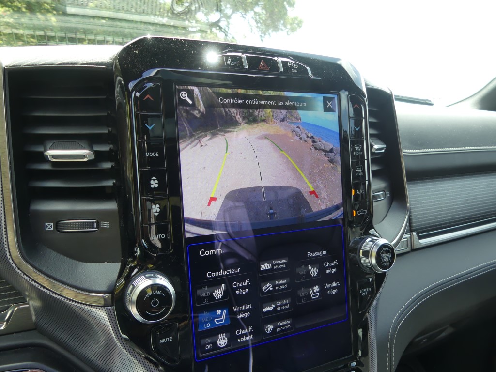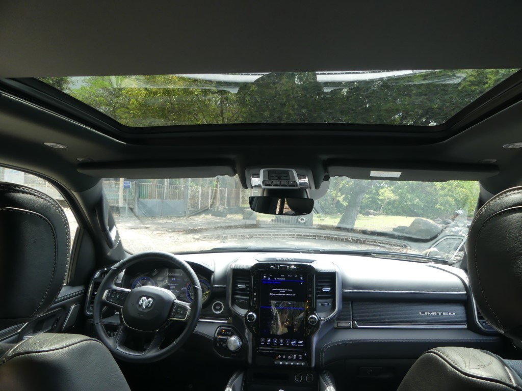 Beaucoup de nouveautés aussi dans l'habitacle de cette nouvelle génération du pickup Ram 1500. La sellerie est nouvelle, on y découvre de superbes sièges en cuir dont le dessin a été revu, ces sièges sont chauffants et climatisés, à l'avant comme à l'arrière, une première sur un pickup. Le dessin du tableau de bord est nouveau lui aussi, on y trouve un nouvel écran central UConnect de 12 pouces tactile en position verticale, qui n'est pas sans rappeler les impressionnants écrans tactiles des Tesla. L'auditorium Alpine est maintenant remplacé par une sono haut de gamme Harman Kardon de 900 watts avec 19 enceintes. On constate aussi le nouveau toit ouvrant panoramique qui fait sa première apparition dans le Ram 2019. Est aussi proposé la technologie de recharge du smartphone par induction. Le Ram 2019 inaugure aussi tout un système très complet d'aide à la conduite. Il est maintenant équipé d'un régulateur de vitesse adaptatif avec système anticollision, il est équipé de détecteurs aux angles morts et d'un système d'aide au maintien dans sa voie de circulation. Une nouvelle caméra de parking à 360 degrès vient en aide aux radars de stationnement avants et arrières. Et si cela ne suffit pas, ce nouveau Ram peut se garer tout seul grâce à l'Active Park Assist. Il est maintenant aussi équipé de la technologie Start & Stop.