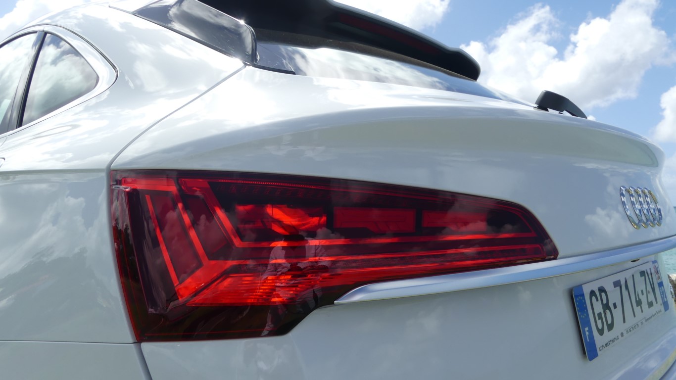 Revenons sur le modèle que nous proposons aujourd’hui et pas le moindre, il s’agit du Q5 50 TFSi.e SPORTBACK S-Tronic Design le plus vendu de la marque ! Le plus grand changement entre ce modèle et le Q5 standard est, bien évidemment, cette ligne de toit. Le haut de notre version Sportback s’incline doucement vers l’arrière, les vitres latérales les plus à l’arrière se rétrécissant fortement également. Cette modification donne au véhicule un profil vraiment dynamique. De profil on retrouve bien l’esprit coupé donc sportif voulu surement par les ingénieurs de De même, le rétroéclairage est fortement incliné pour correspondre à l’angle descendant du couvercle. À l’avant, cette nouvelle variante 'e' du Q5 comporte une calandre octogonale à cadre unique familière, une remplie d’une texture rhomboïde unique. Naturellement, attendez-vous à des changements extérieurs mineurs aux entrées d’air avant et aux pare-chocs en fonction du niveau de finition et des ensembles d’options.