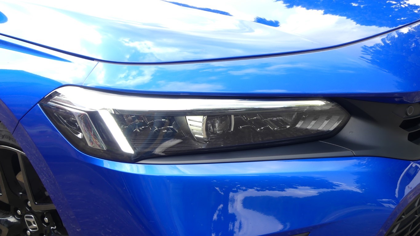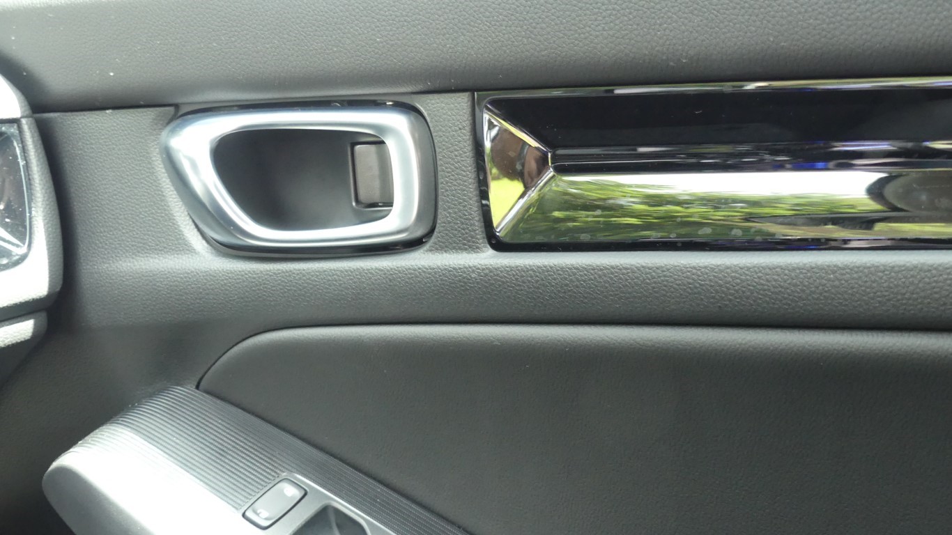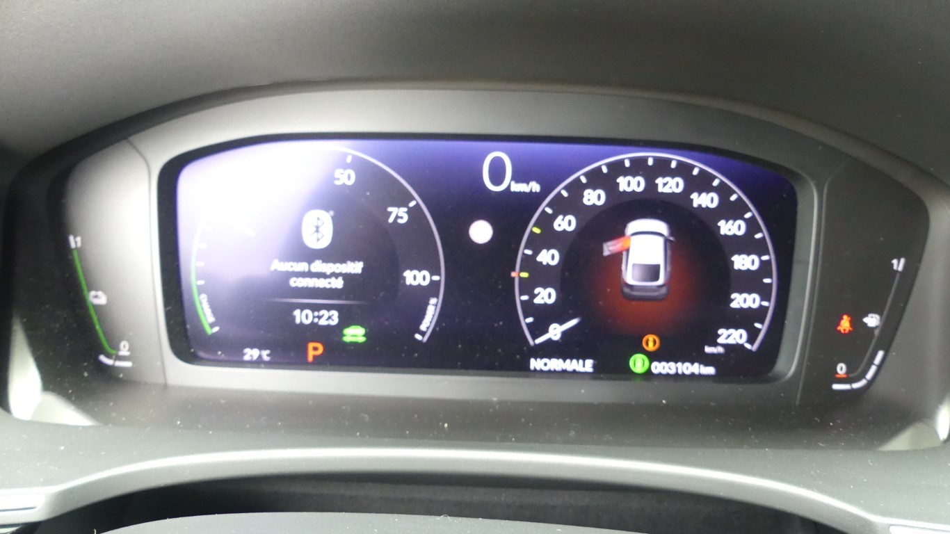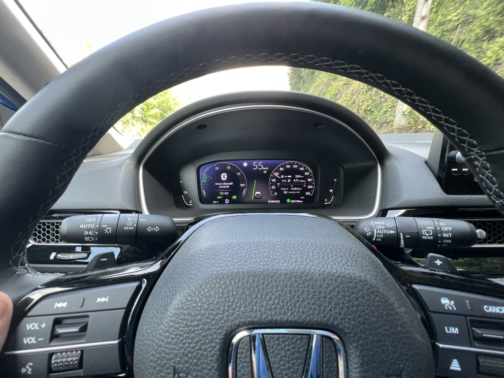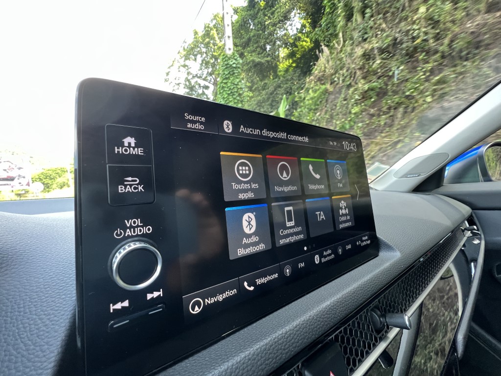 De prime abord le système hybride de la Civic n'est pas exactement le même que celui du CR-V, par exemple. Le 2 litres essence est entièrement nouveau, et toute la partie électrique optimisée : recharge plus efficace de la batterie, elle-même plus légère et plus puissante, tout comme le moteur électrique. Mais surtout, le système hybride réagit instantanément aux sollicitations de l'accélérateur, sans la réaction souvent décalée des « full hybrid ». Mais je m'arrête sur le style, HONDA nous propose des lignes de pare-chocs plus expressives, avec notamment des éléments noirs qui assoient l'avant de la voiture et une calandre élégante en nid d'abeilles complétée par des phares à leds assez fins. Le dessin des plis de capot a été retravaillé et les montants de pare-brise ont été reculés pour s'aligner avec le centre des roues et donner une allure plus élancée. Au final, en dépit d'un dessin plus classique, la Civic e:HEV gagne en élégance et dynamisme. On note toutefois des dimensions assez élevées pour une compacte : 4,55 m de long, 1,80 m de large et 1,41 m de haut. La Toyota Corolla lui rend presque 20 cm en longueur. L'empattement généreux de 2,73 m offre cependant un habitacle spacieux mais très sobre.