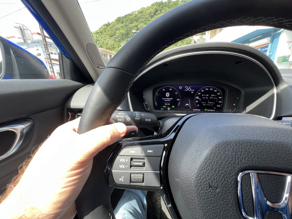 Sur la route, la Civic fait d’abord ce qu'une hybride doit faire : la récupération d'énergie est efficace, la puissance du système électrique permet de s'élancer au feu vert sans trop se retenir, et le mode électrique peut tenir seul jusqu'à des vitesses élevée sur notre rocade ou autoroute. De quoi passer sous les 4l/100km (oui, vous avez bien lu) dans certaines conditions, 4,6l/100km de moyenne totale sur le parcours mixte de notre essai. Avec ce CVT il n'y a pas de transmission à variation continue, mais un seul rapport fixe, il fait montre d'une grande souplesse d'utilisation. La mécanique fait preuve d'un certain brio et les relances sont efficaces, surtout à bas et moyen régimes. Pour ne pas perturber les clients traditionnels qui s'interrogeraient sur l'hybride, Honda a simulé des passages de rapport en jouant sur des variations de régime du moteur thermique. Comme celui-ci n'est pas directement relié aux roues, on ne ressent pas les changements de rapport. je suis spécailement surpris par une belle reprise qui décoiffe assurément même dans la montée de Case-Pilote !!!