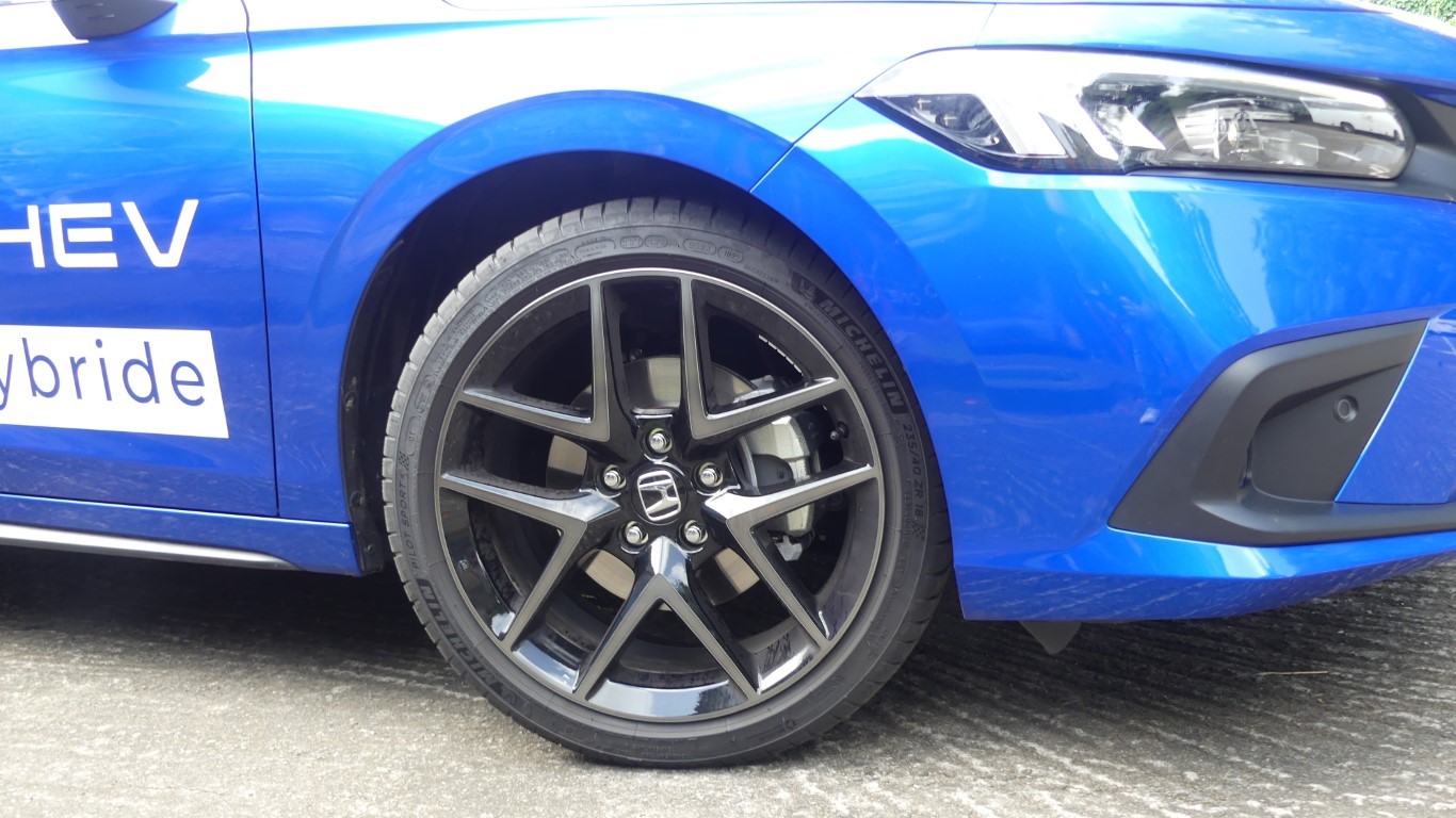 Honda a réalisé un gros travail sur le châssis de sa Civic e:HEV. En plus d'un empattement allongé, les voies arrière ont été élargies de 18 mm et, surtout, la rigidité torsionnelle a été augmentée de plus de 20 %. Même les suspensions et la direction ont été retouchées. À la conduite, le résultat est particulièrement probant avec un toucher de route excellent et une caisse capable d'offrir à la fois une tenue de route confortable et un comportement dynamique. Le point le plus haut du toit a également été reculé par rapport au dernier millésime et abaissé de 2,5 cm, avec une pente douce en direction du hayon, lequel a lui-même été allégé de 20 % pour faciliter son maniement.