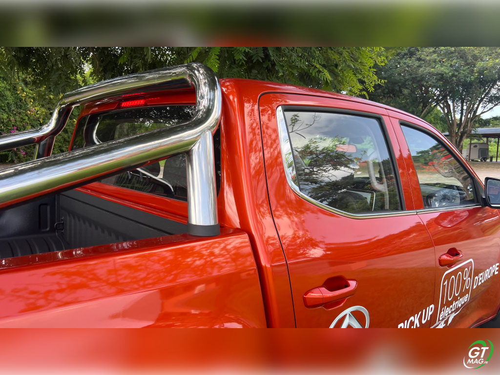 Ce modèle adopte les caractéristiques classiques des Pick-Up avec une face avant robuste, dotée d'une calandre immense, ornée de contours et d'inserts chromés à l’américaine et un peu dans l’excès, mais on aime cet air costaaud terminé par des feux LED très tranchants. L'avant du véhicule est réussi et soigné… Le pick-up électrique propose également une double cabine spacieuse (nous y reviendrons plus en détail), et est équipé d'une benne avec arceau. L'arrière du véhicule offre une touche d'originalité avec ses feux latéraux reliés par un bandeau rouge, qui, malheureusement, n'est pas lumineux mais simplement une bande de couleur uniforme. De loin, l'effet est plus marqué.