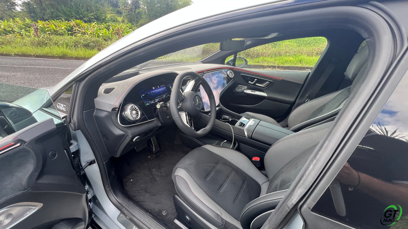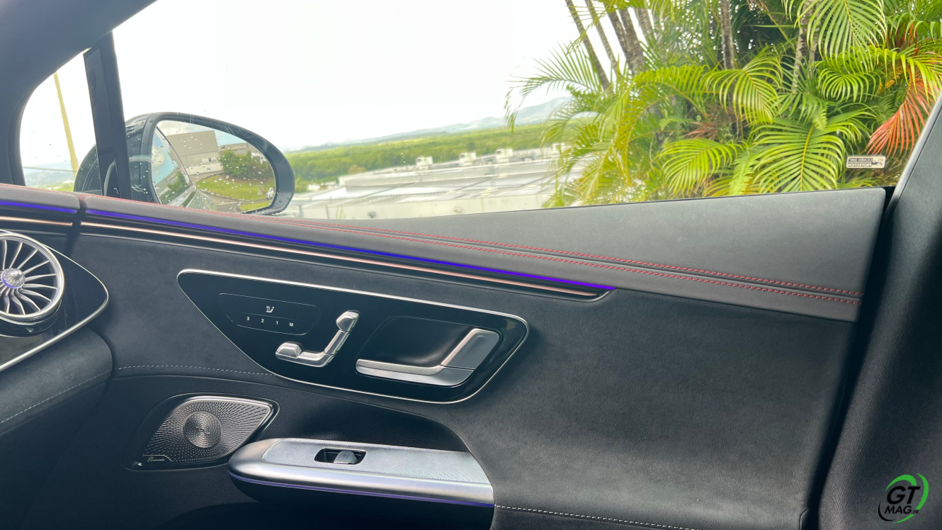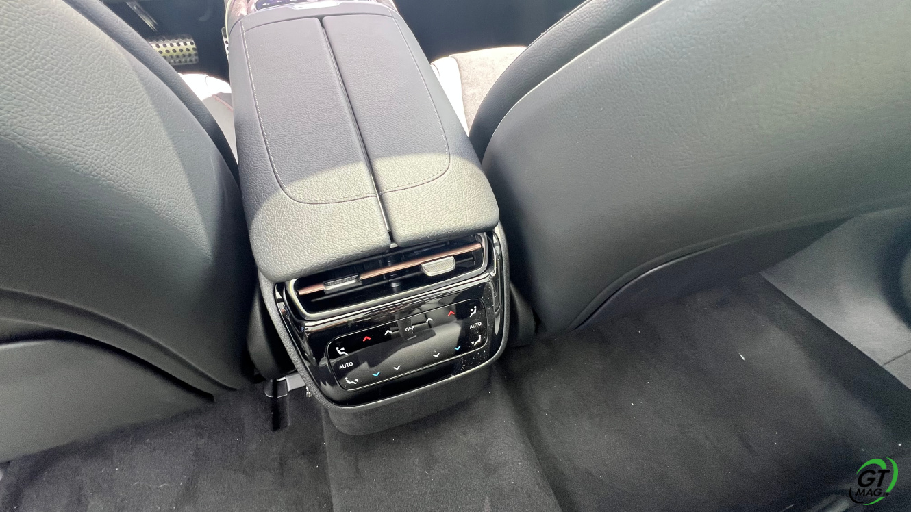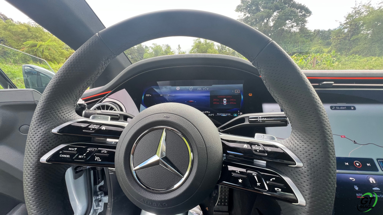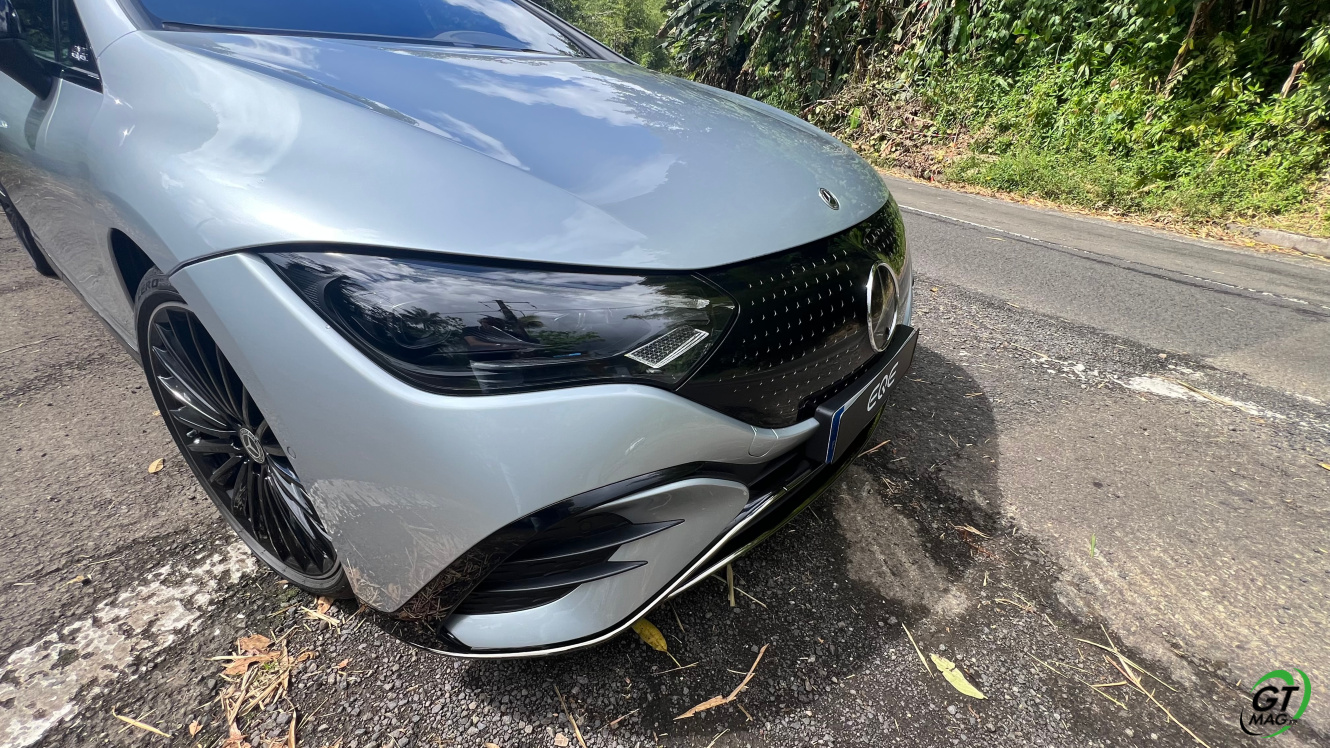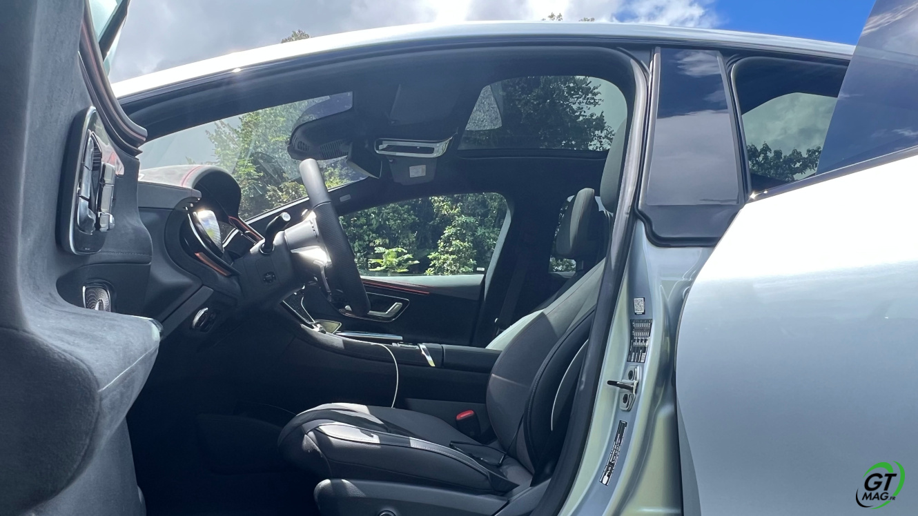 AMG Design ! La version testée aborde une finition AMG Line avec le Pack Premium Plus qui inclut un kit de carrosserie très spécifique avec une calandre étoilée, un toit ouvrant panoramique, le vitrage athermique foncé (pack Sport Black) ou encore les phares LED adaptatifs. Les pare-chocs avant sont de la couleur de la carrosserie avec une partie inférieure en noir. Pour garnir le menu, l’habitacle est également enrichi avec des sièges avant chauffants, ventilés et à réglages électriques, recouvert d’un « simili cuir alcantara ». La console centrale est ergonomique et bien agencée dans notre Mercedes EQE 350 AMG-Line… La suspension pneumatique Airmatic. Cette dernière est un exemple de douceur et de progressivité, elle qui se montre d’une prévenance extrême avec les passagers. Les nids de poule ? A peine ressentis dans l’habitacle. Les dos-d’âne ? quasi effacés. Le bitume de mauvaise qualité ? Avalé avec discrétion et sureté…