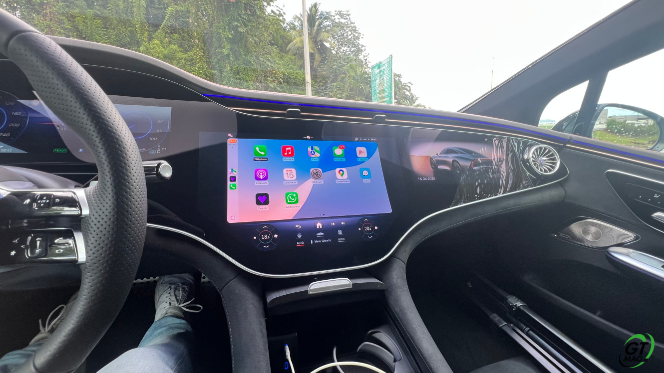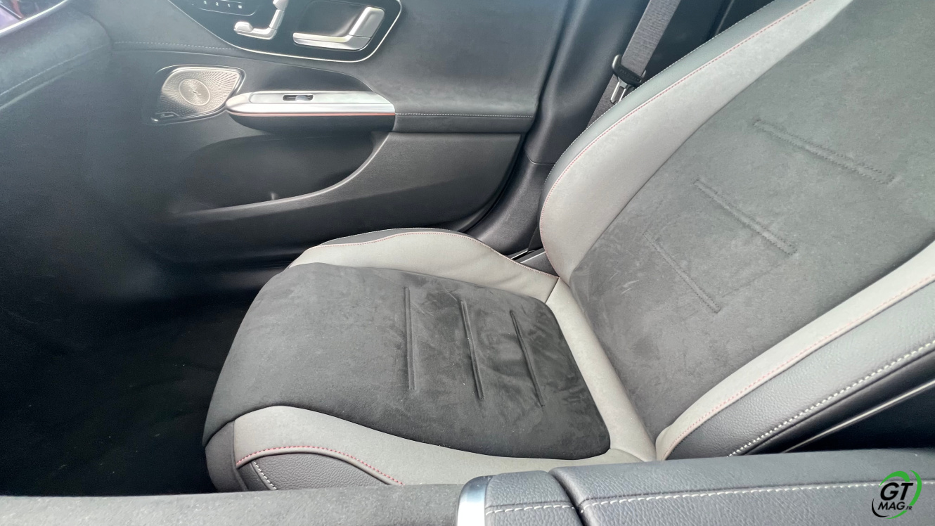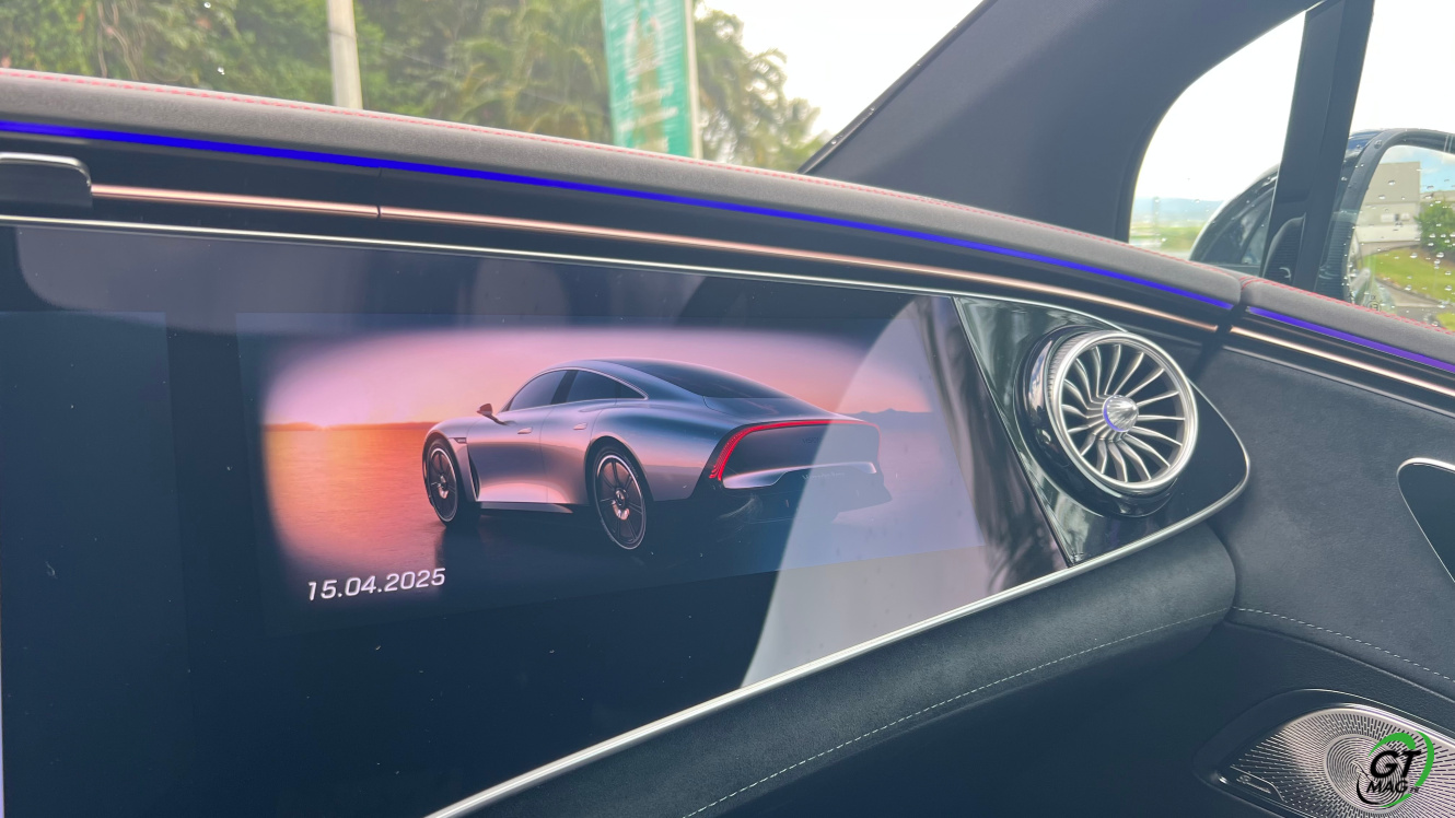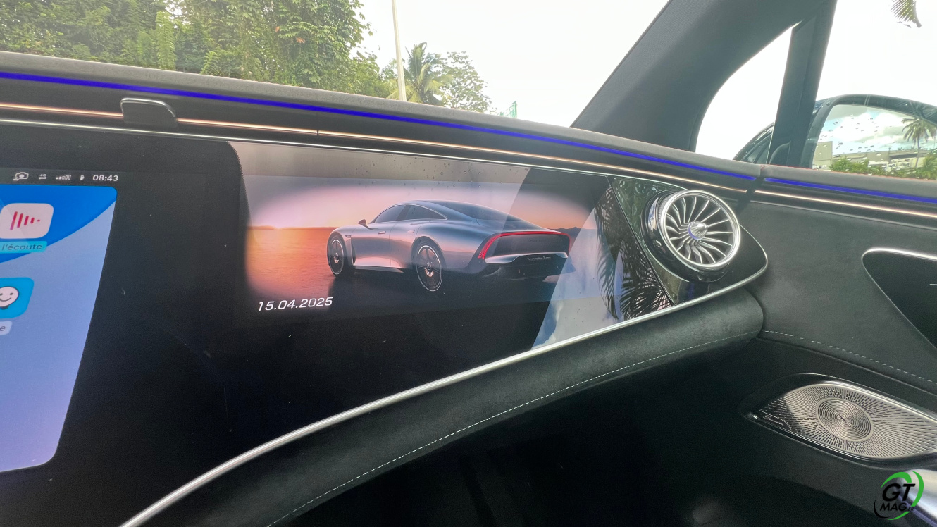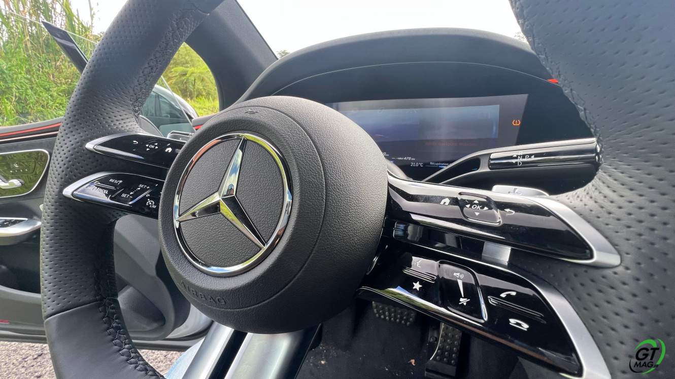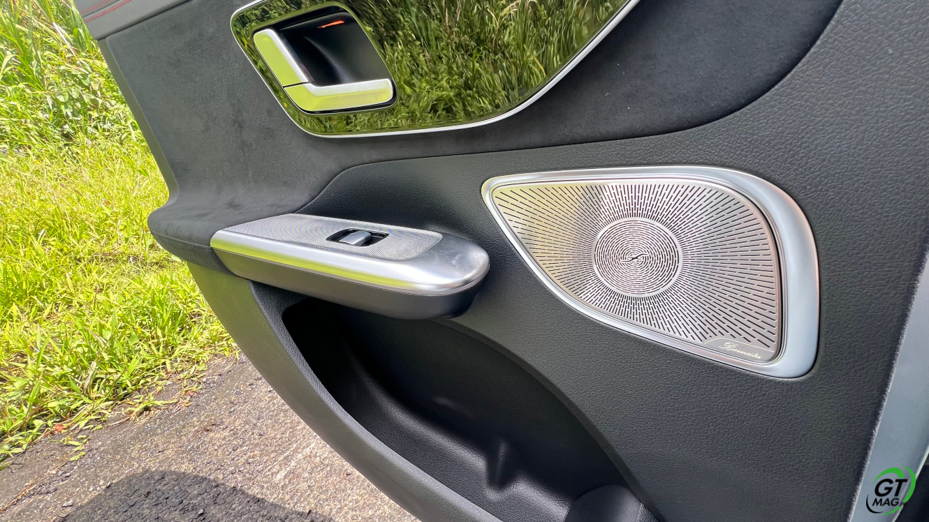 AMG Design ! La version testée aborde une finition AMG Line avec le Pack Premium Plus qui inclut un kit de carrosserie très spécifique avec une calandre étoilée, un toit ouvrant panoramique, le vitrage athermique foncé (pack Sport Black) ou encore les phares LED adaptatifs. Les pare-chocs avant sont de la couleur de la carrosserie avec une partie inférieure en noir. Pour garnir le menu, l’habitacle est également enrichi avec des sièges avant chauffants, ventilés et à réglages électriques, recouvert d’un « simili cuir alcantara ». La console centrale est ergonomique et bien agencée dans notre Mercedes EQE 350 AMG-Line… La suspension pneumatique Airmatic. Cette dernière est un exemple de douceur et de progressivité, elle qui se montre d’une prévenance extrême avec les passagers. Les nids de poule ? A peine ressentis dans l’habitacle. Les dos-d’âne ? quasi effacés. Le bitume de mauvaise qualité ? Avalé avec discrétion et sureté…