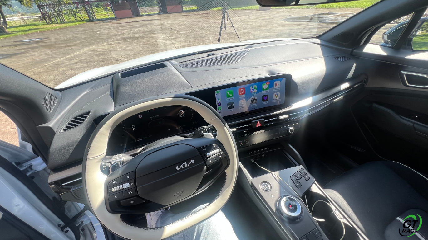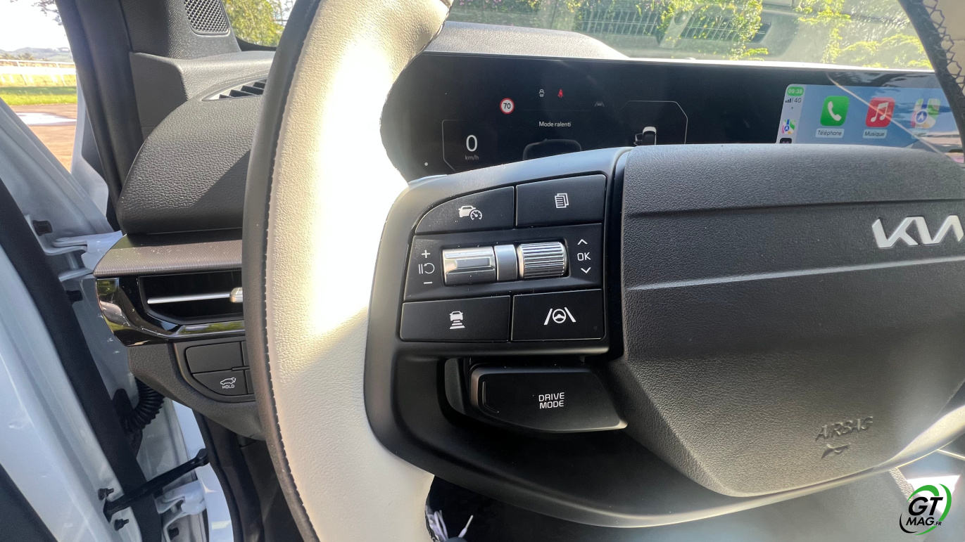 L’intérieur se transforme également très nettement…. Le Sportage hybride restylé reçoit de série un tableau de bord numérique de 10 pouces et un écran central tactile incurvé de 12,3 pouces réunis au sein d’une double dalle aux bords moins épais qu’auparavant. Les aérateurs de forme inédite sont maintenant rassemblés dans un bandeau ininterrompu courant sur toute la largeur de la planche de bord. Sous l’écran central, le réglage de la température passe toujours par des molettes. Les autres commandes de la ventilation sont plus ergonomiques. Entre le nouveau volant à deux branches et la console centrale, les ingénieurs ont su garder des boutons dédiés à certaines aides à la conduite, telle celle garantissant le maintien du véhicule dans sa voie. Conduite semi-autonome de niveau 2, caméras à 360° et chargeur de smartphone à induction font partie des équipements de notre modèle d’essai… Tout cela est résolument plus moderne…