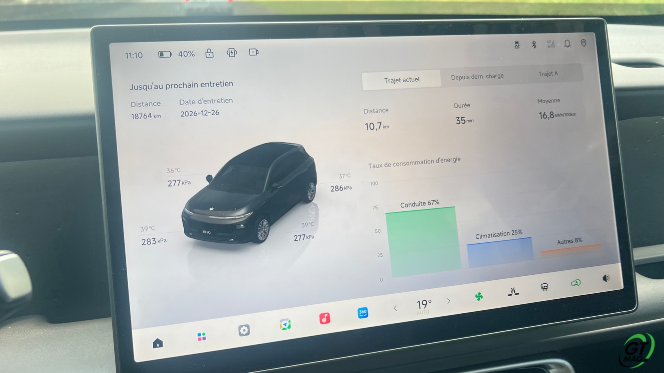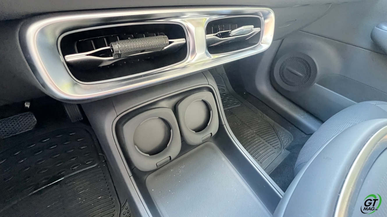 Dans l’habitacle, le Leapmotor B10 suit son propre chemin avec une planche de bord à deux étages. À notre grand étonnement et plaisir, on trouve des buses de ventilation, ainsi qu’un espace de rangement bien pratique devant le passager. En sus, il y a un grand bac dans la console centrale et deux porte-gobelets escamotables. Une chose est sûre : ce ne sont pas les rangements qui manquent ! D’ailleurs, toujours sur le point du rangement et de l’habitabilité : le Leapmotor B10 joue bien de sa taille pour offrir un habitacle généreux. Devant comme derrière, tous les passagers seront bien assis, tandis que le coffre taille à 430 litres. Mieux encore, il y a 25 litres d’espace sous le capot. Pratique pour les câbles ! Côté infodivertissement, tout passe va une grande dalle tactile de 14,6 pouces – en plus d’une instrumentale digitale de 8,8 pouces. Quand on dit « tout », c’est vraiment « tout », puisque le B10 ne présente aucun bouton. Pas même pour régler les rétroviseurs…