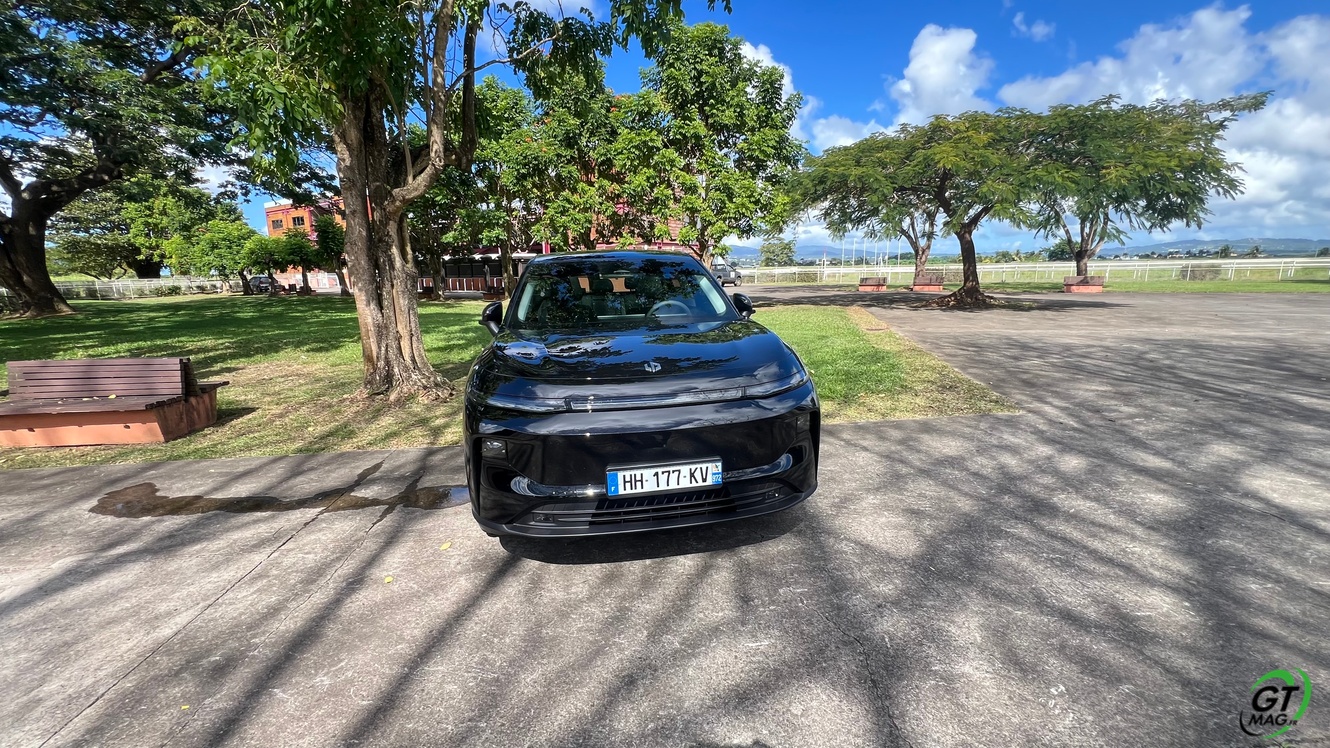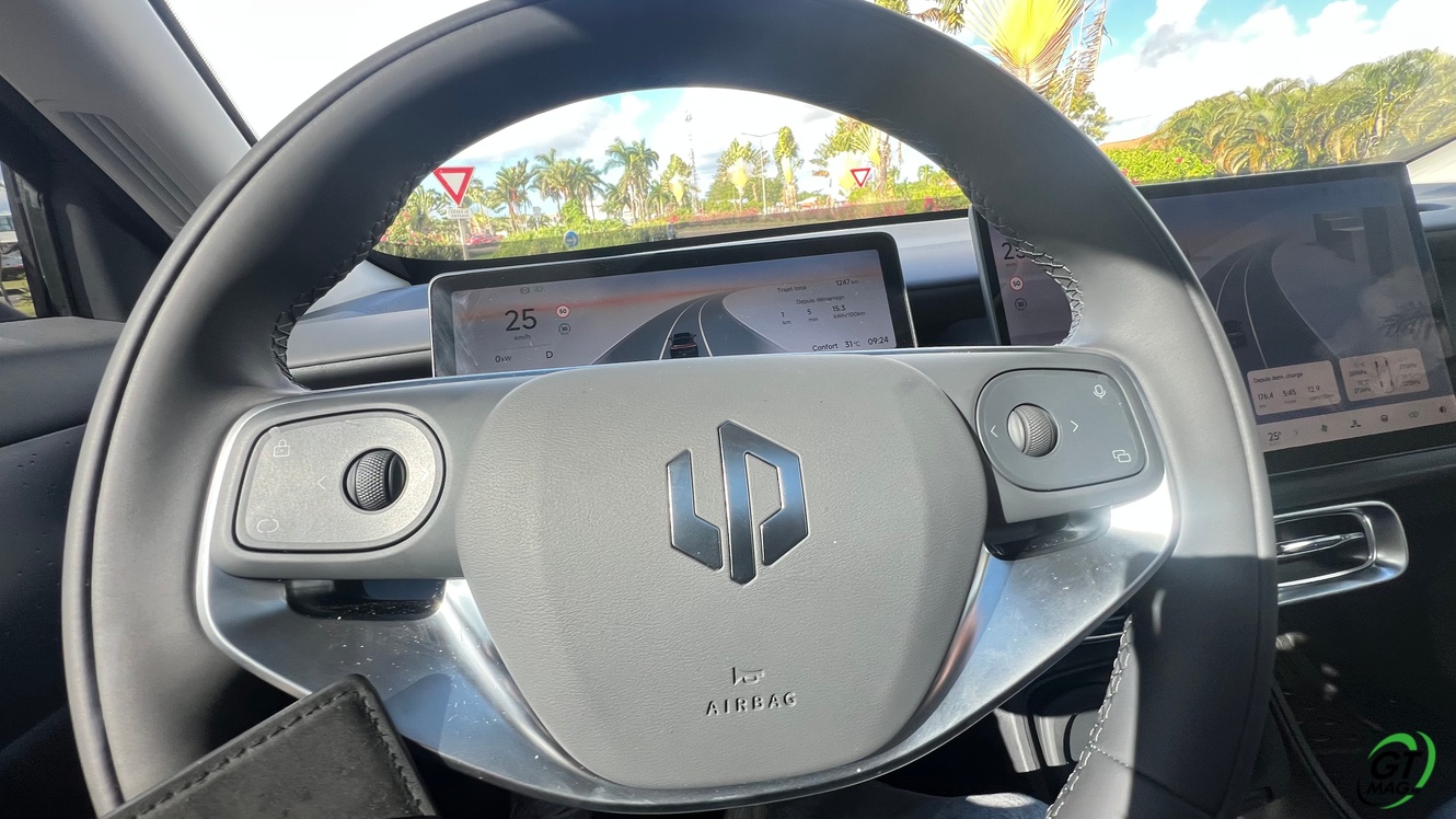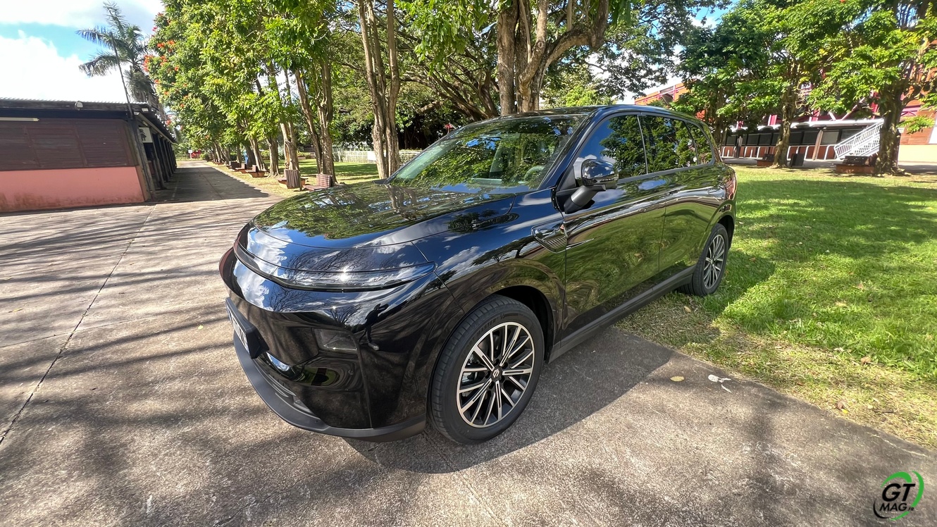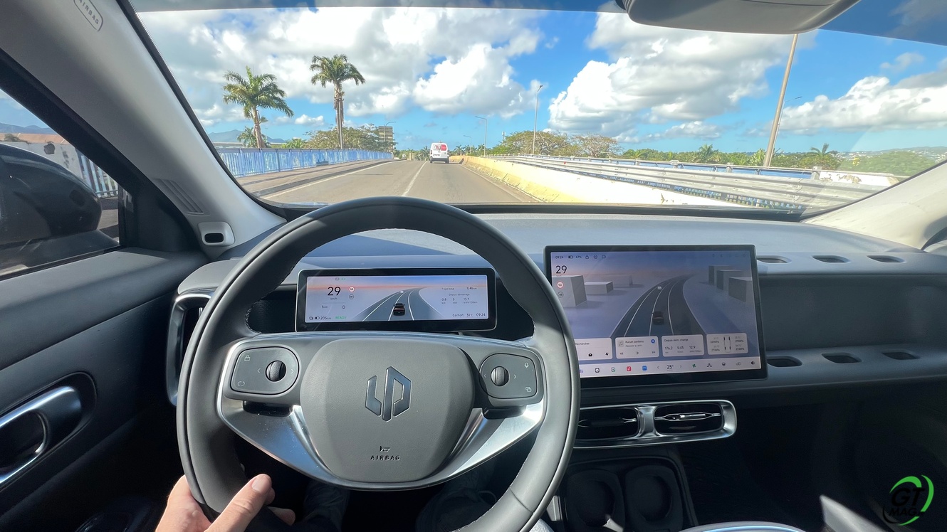Les Leapmotor B10 et C10 partagent une plateforme et leurs technologies. Pas étonnant donc de retrouver le moteur électrique de 218 ch sur le train arrière du petit crossover. Il présente aussi une suspension McPherson à l’avant, 5 bras à l’arrière et même une répartition du poids 50/50. Ce dernier élément est sans doute aidé par les batteries. Eh oui, il y a en a deux au catalogue on l’a vu. En Martinique la grande batterie présente une capacité de 67,1 kWh, ce qui lui permet d’offrir une autonomie de 434 km. Elle charge à 168 kW elle prendra 20 min pour passer de 10 à 80 % de charge sur une borne rapide. Côté consommation et d’après mes petits calculs, il faudra toutefois tabler sur un appétit moyen gravitant autour des 16 à 18 kWh/100 km, soit près de 360 km à 390 km d’autonomie. Ma conduite, mon style ont été plutôt raisonnable flirtant parfois avec une écoconduite que je maitrise très bien, mais aussi des moments d’accélérations voulues et prolongées sur notre rocade ou autoroute…