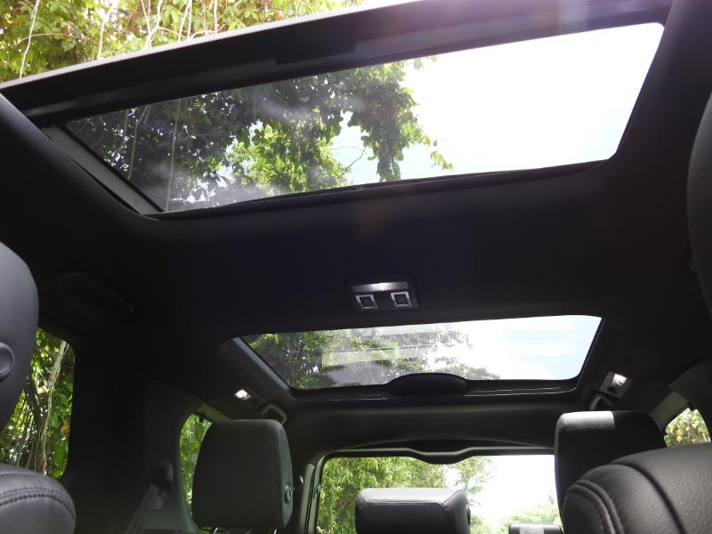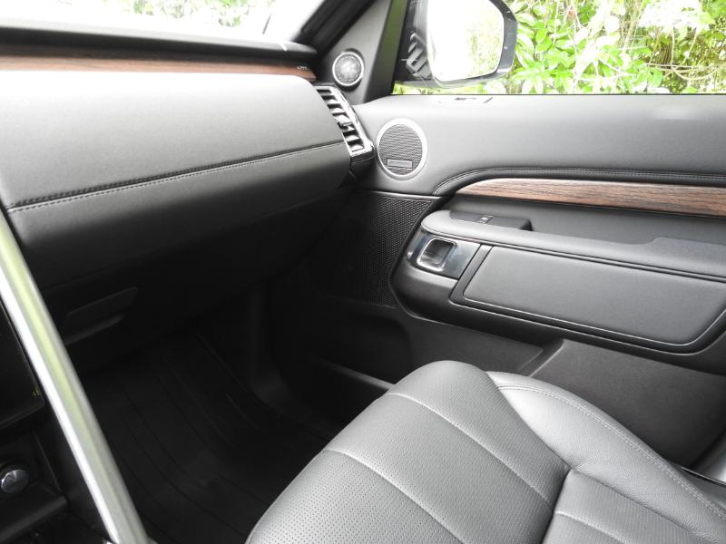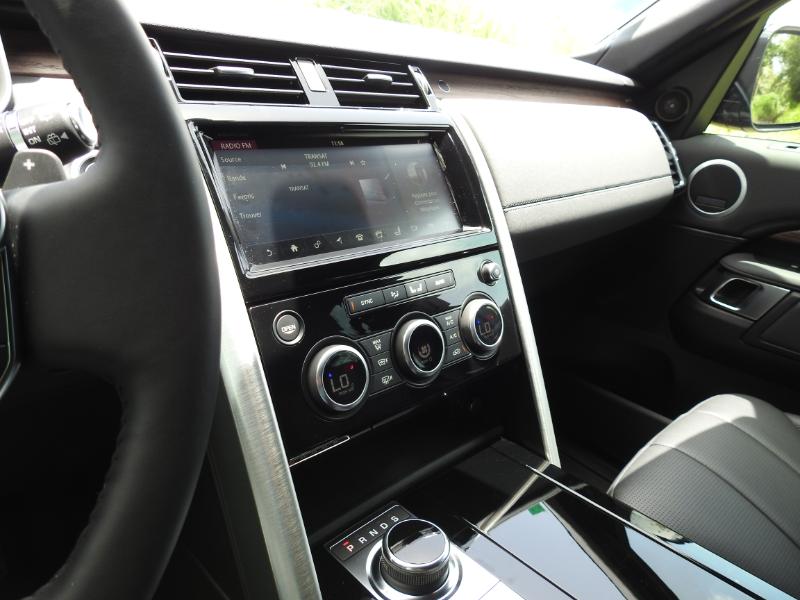 À l’intérieur, la montée en gamme est également évidente. La planche de bord du modèle sortant cède sa place à un meuble désormais en phase avec les dernières tendances à Solihull. Placages de bois et profusion de cuir concurrent à rendre l’habitacle chaleureux comme savent si bien le faire les Britanniques. Les formes rectilignes du tableau de bord sont dominées par la présence d’un écran tactile de 10,2 pouces (en série sur les versions les plus huppées). Le Discovery dispose d’un système WiFi capable de connecter jusqu’à 8 appareils et offre 9 ports USB et 4 points de recharge 12 V.