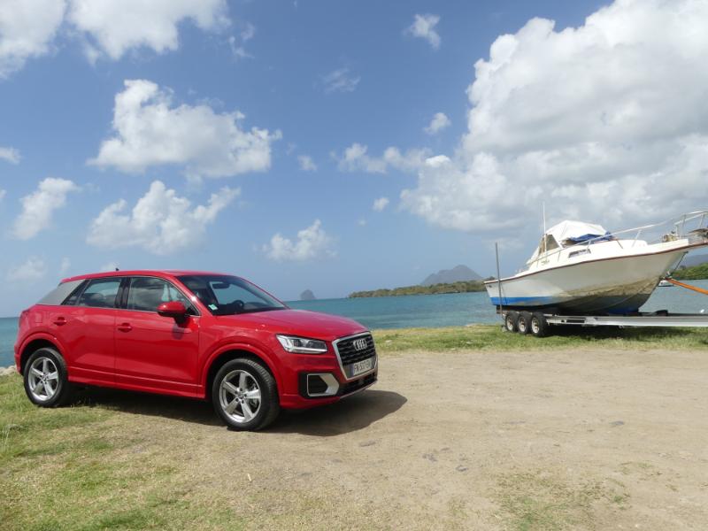 Avant tout destinée à un usage urbain, l’Audi Q2 est un savant mélange de coupé, citadine et SUV. Avec son design exubérant sans pour autant rompre avec les codes de la marque, le Q2 comble un vide dans une gamme qui manquait d’une petite citadine baroudeuse. Si il ne pourra pas vraiment s’aventurer loin des sentiers battus sans sa transmission Quattro, il devrait néanmoins aisément trouver sa clientèle chez les citadins en quête d’un petit SUV confortable et compact. Son prix d’appel en promotion à partir de 25900 €, et il faudra mettre la main à la poche (40650€), pour vous offrir un véhicule plus complet comme celui de notre essai en Martinique avec notamment les indispensables Allumage Auto des feux, le système Start and Stop, le radar avant et arrière l'ESP EBV et ASR etc... Son comportement est sobre et familiale, l’Audi Q2 se propose comme une très bonne auto, notamment pour arpenter les rues de nos villes et bourgs.
